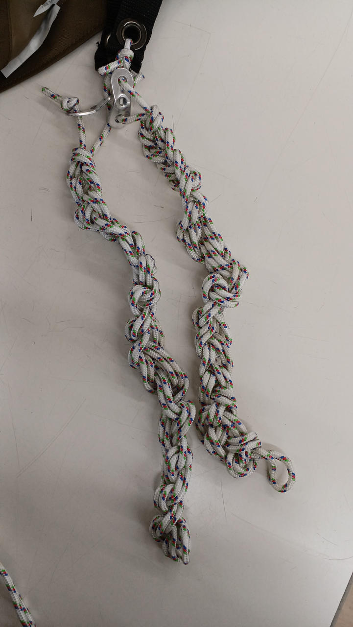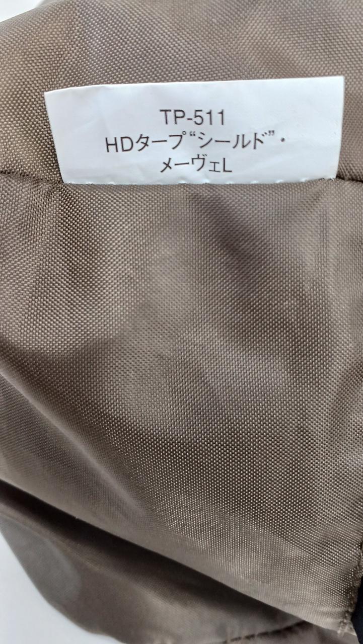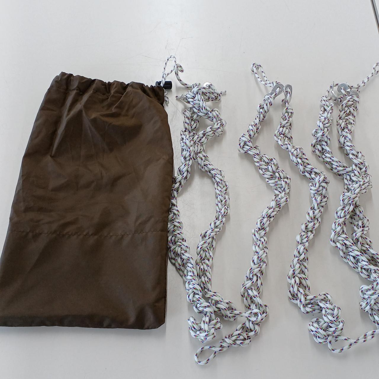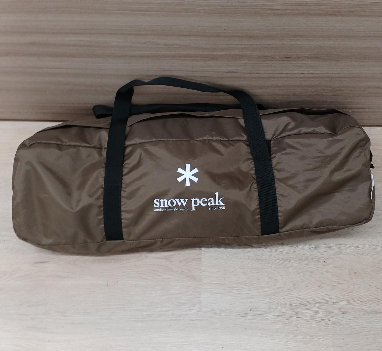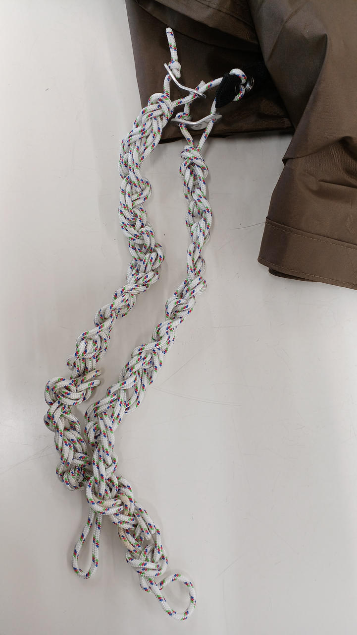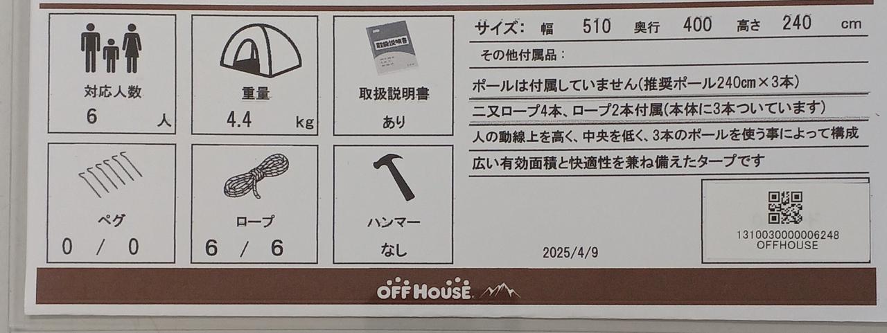 3本のポールを使うことによって、人の導線を高く、中央を低くなるような形のタープ、少し汚れあり