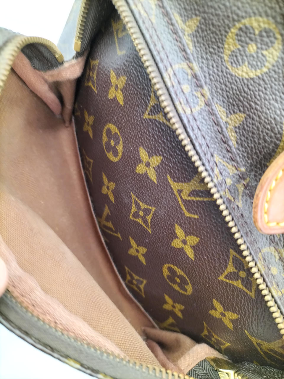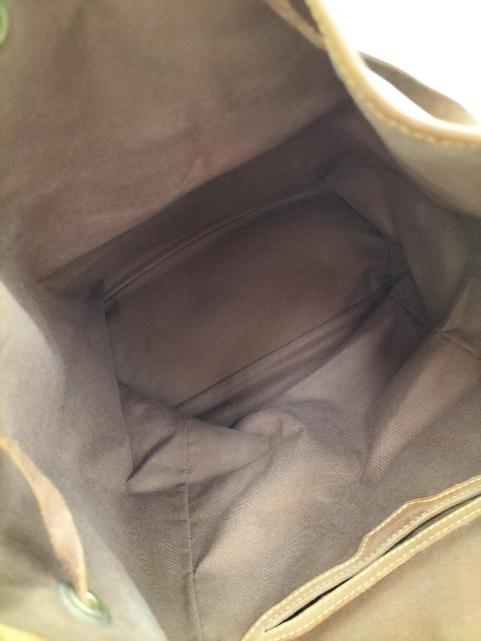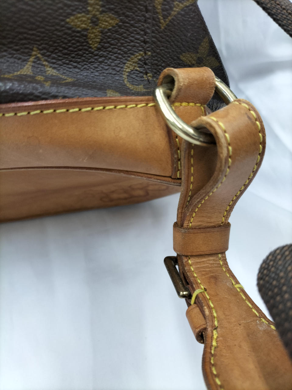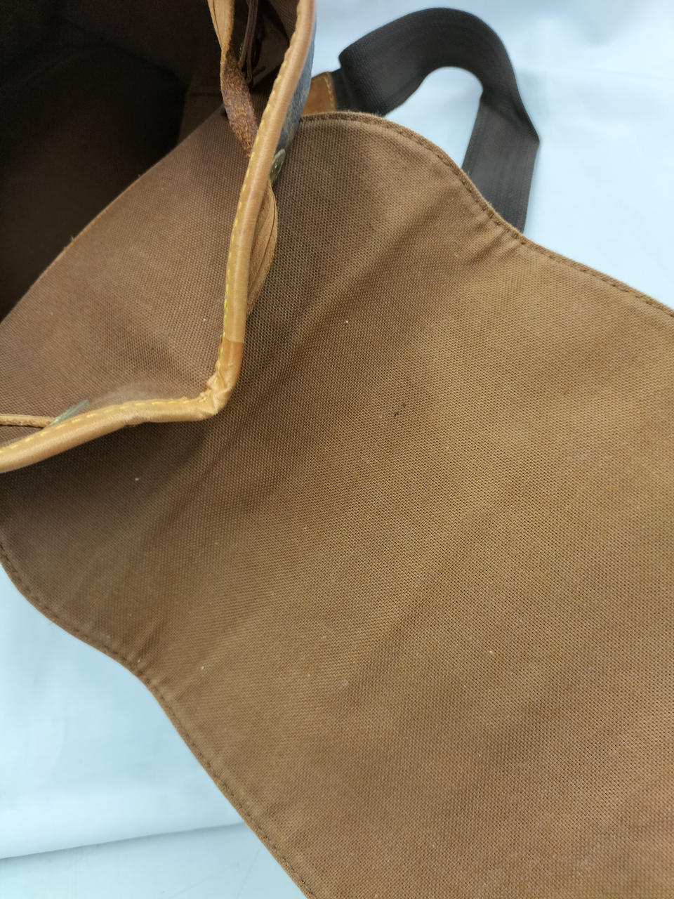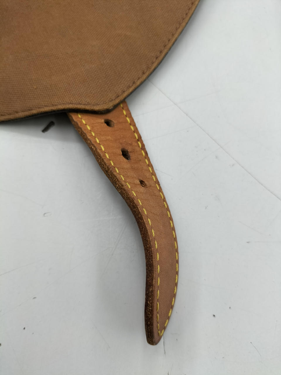 革部分全体に変色あり。黄色糸一部ほつれあります。内側は比較的キレイです。