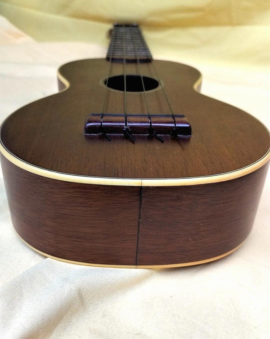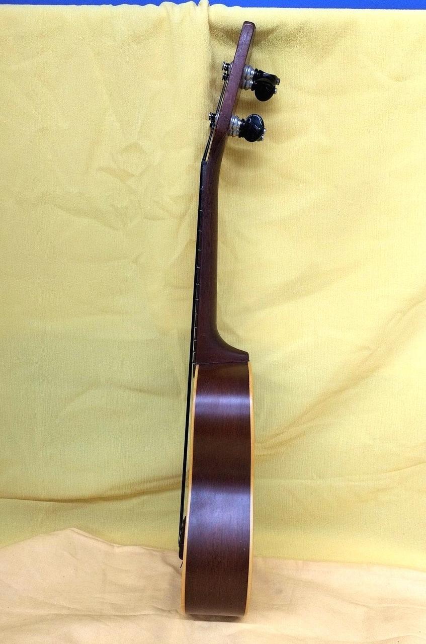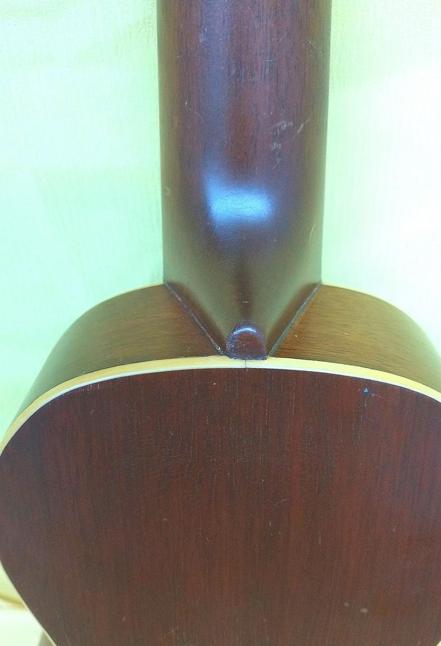Martinのヴィンテージウクレレにはシリアル番号が入っておらず、正確な製造年の特定は出来ないものの、1962年から輸出のためにmade in USAの刻印が始まり、本楽器にはその刻印があるため1962年以降の物と思われます。おそらくボディはマホガニー指板はハカランダ。※※ボディ内に補修跡あります。