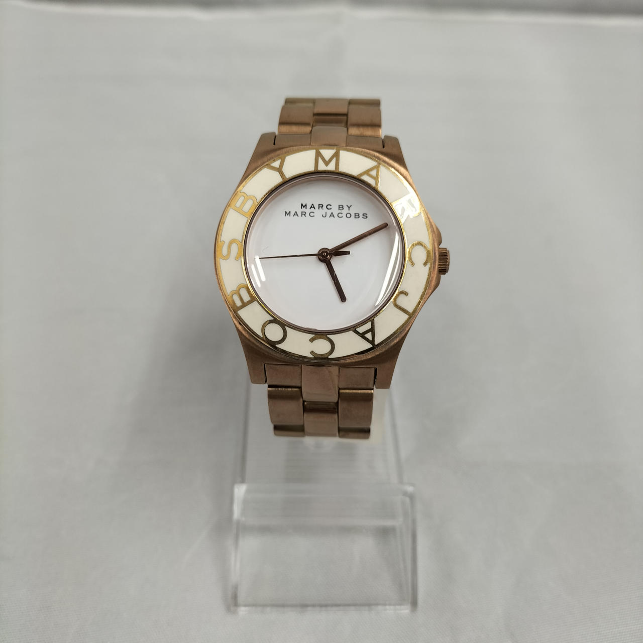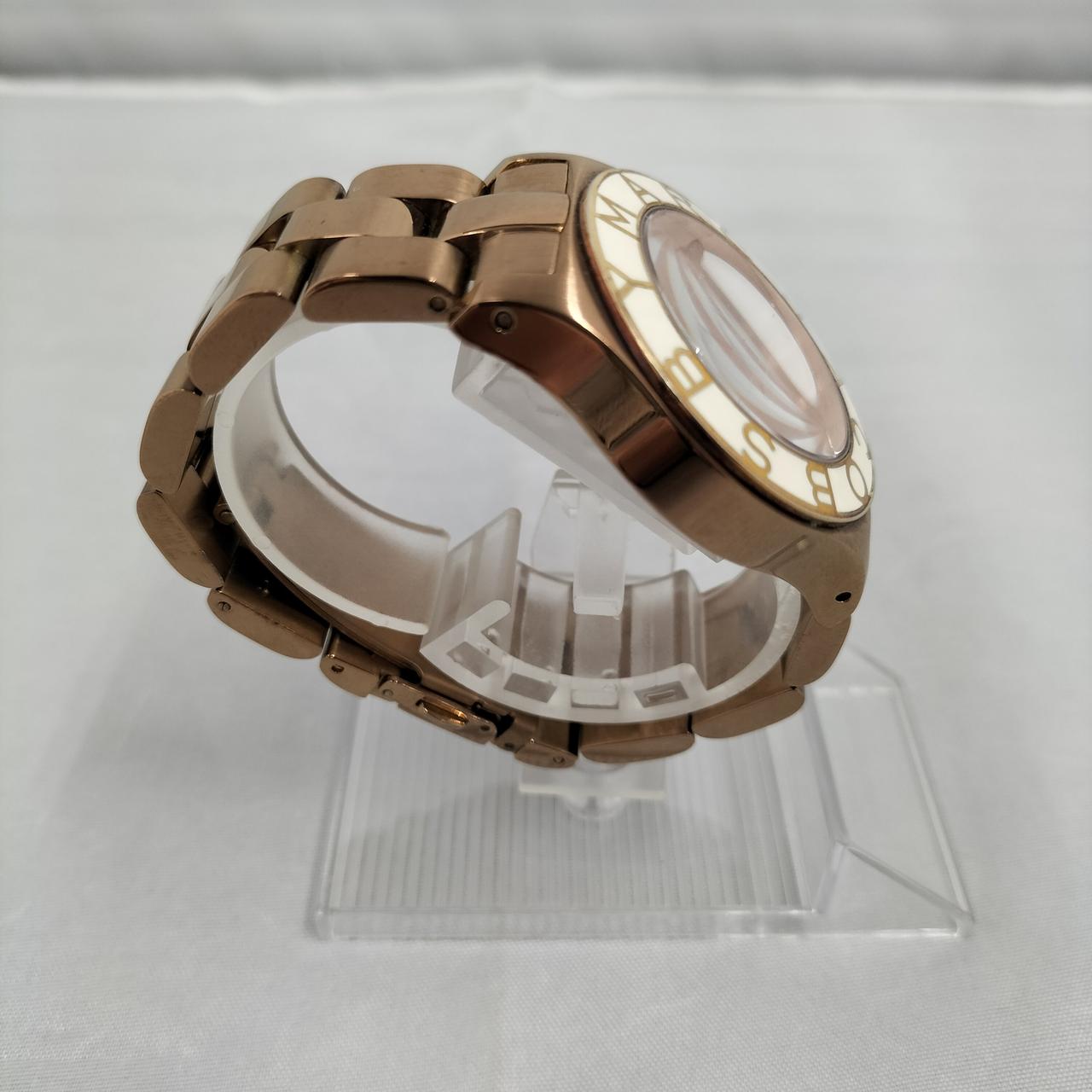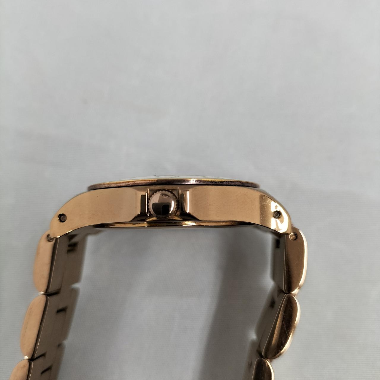 白い文字盤にゴールド色のロゴが映えるデザインの腕時計です!
