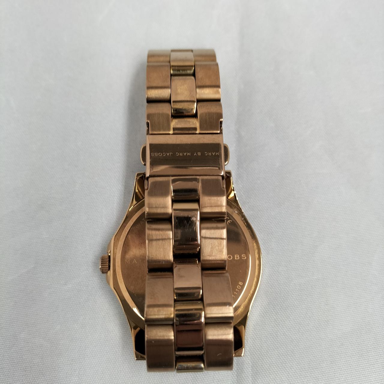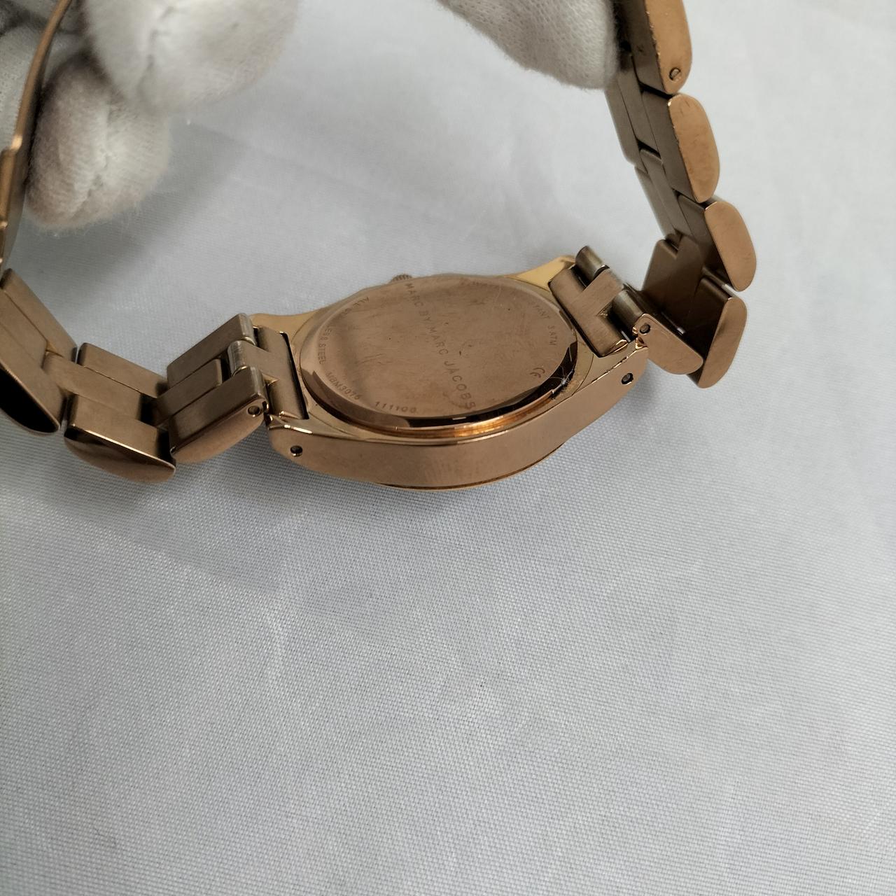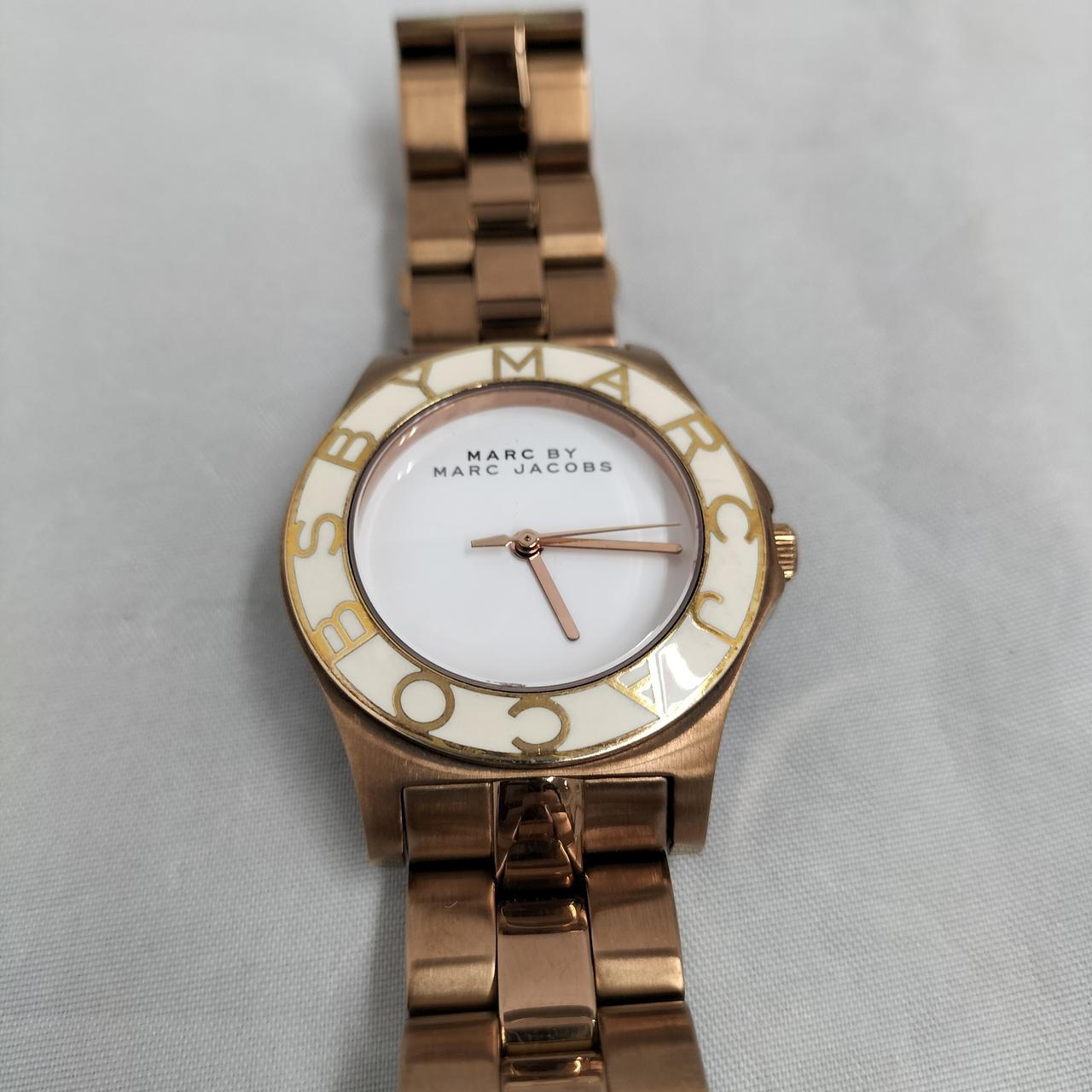 白い文字盤にゴールド色のロゴが映えるデザインの腕時計です!
