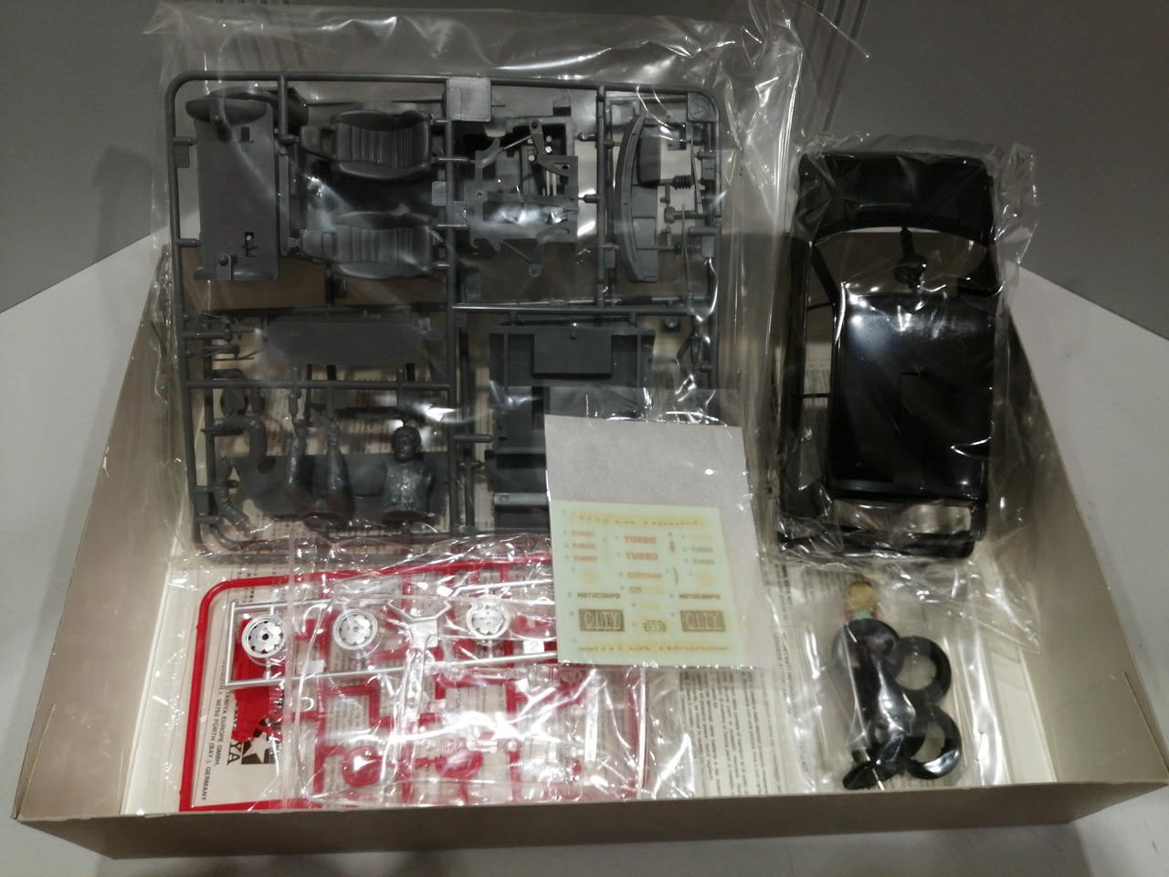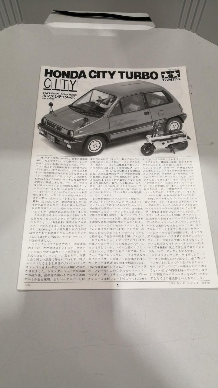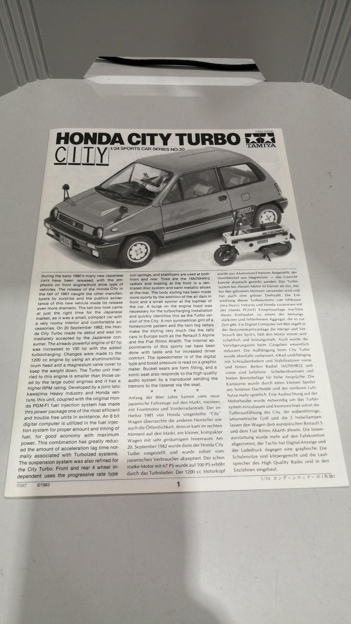 ホンダの往年の名車シティターボが1/24スケールのプラモデルで復活です。未組み立て商品です。説明書は日本語版と英語版2種類あります。