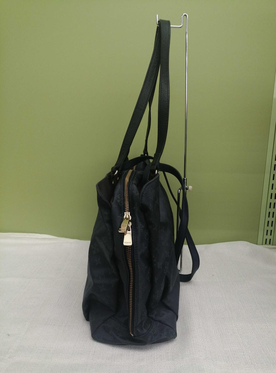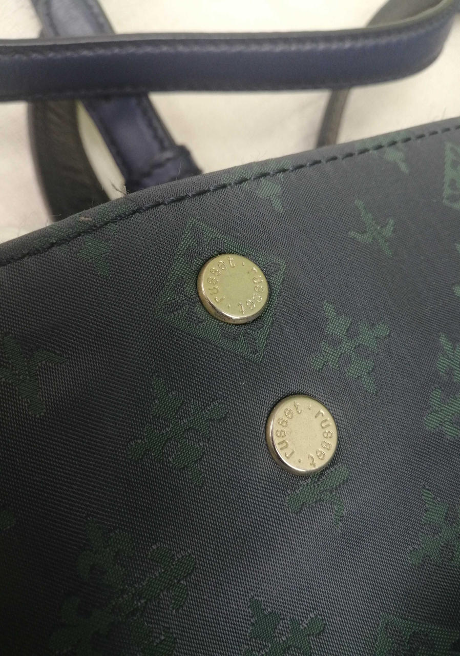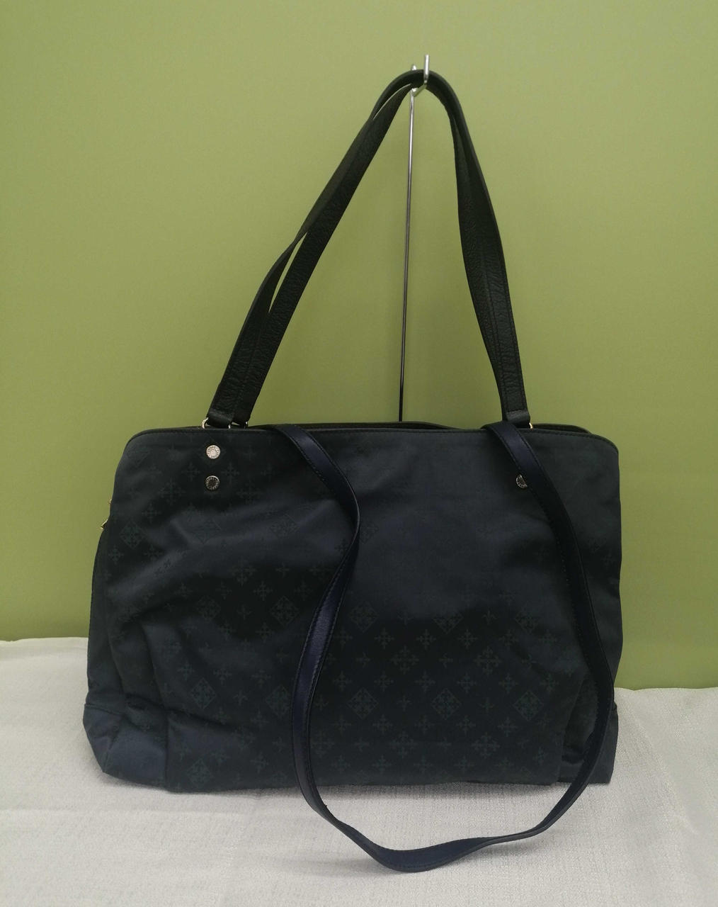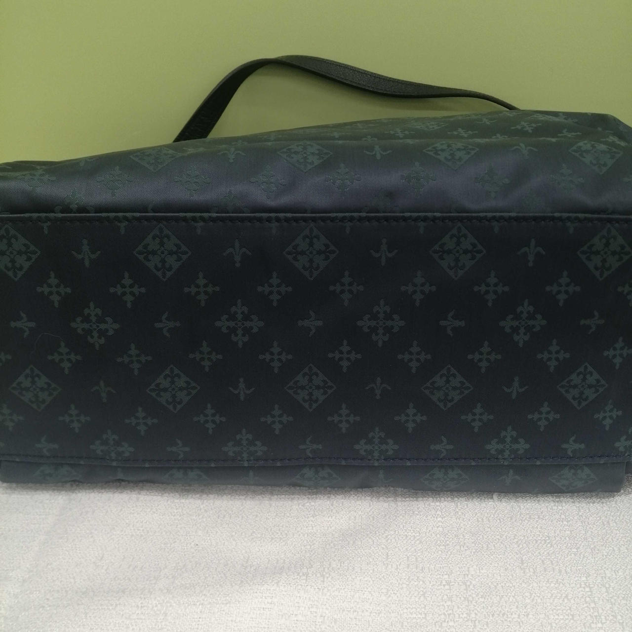 ブルー生地にグリーン色のロゴ模様がきれいなバッグです。収納力もありそうです。