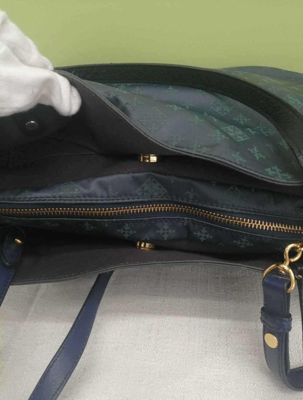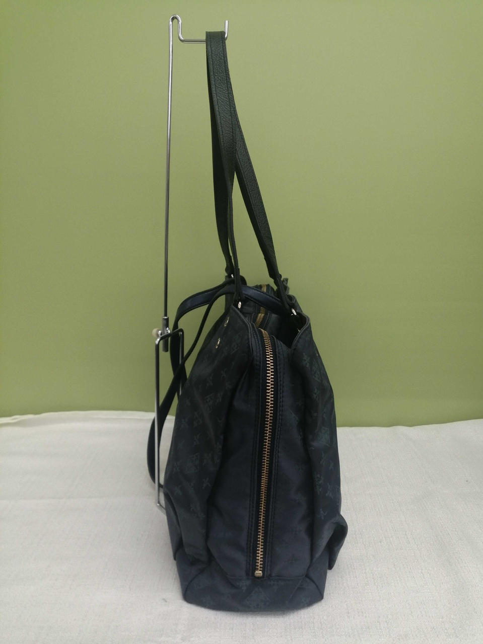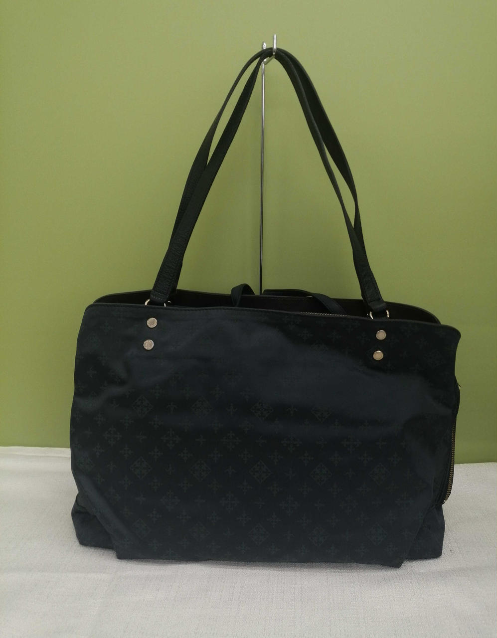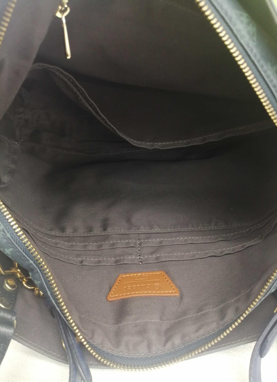 ブルー生地にグリーン色のロゴ模様がきれいなバッグです。収納力もありそうです。