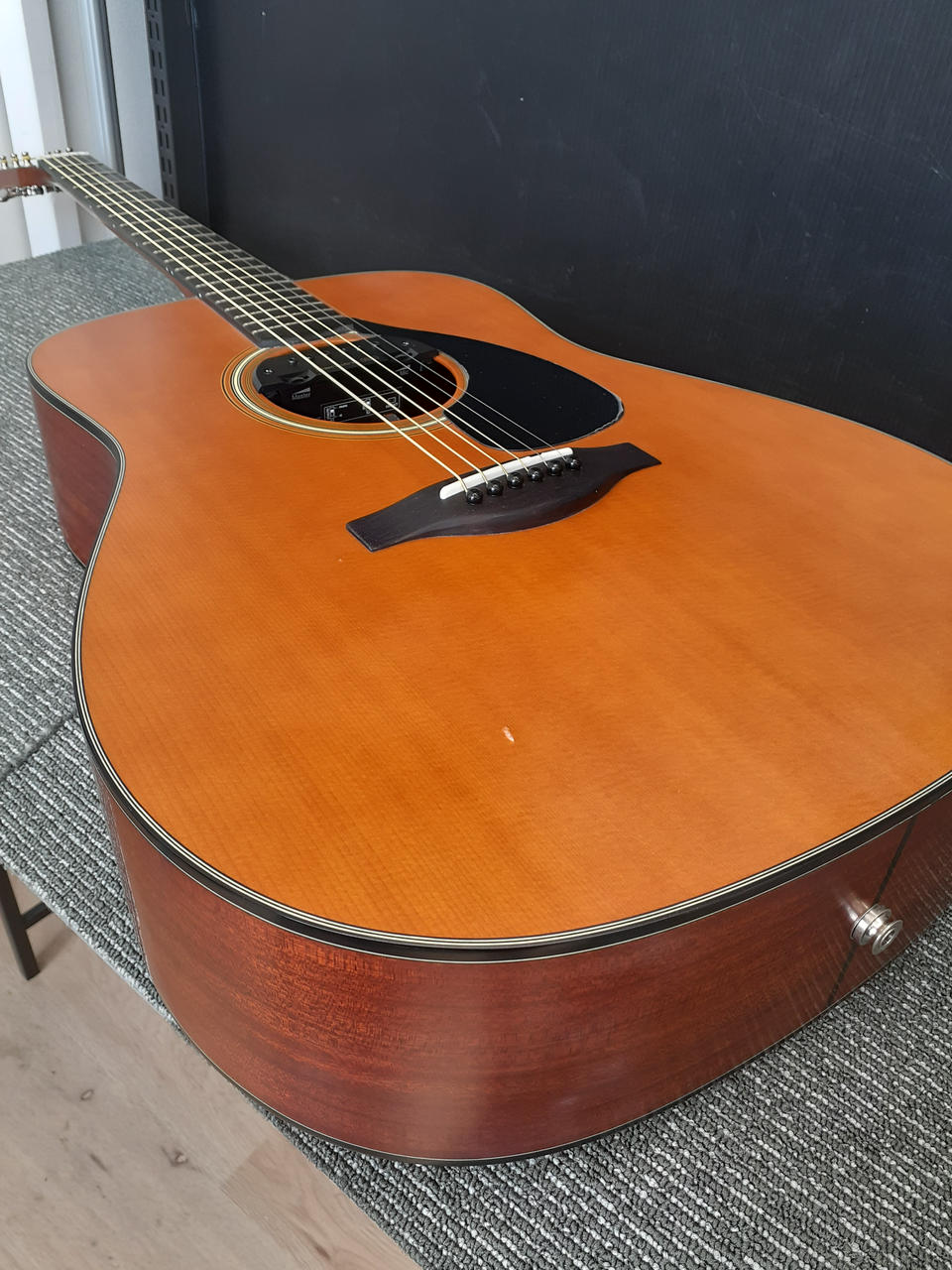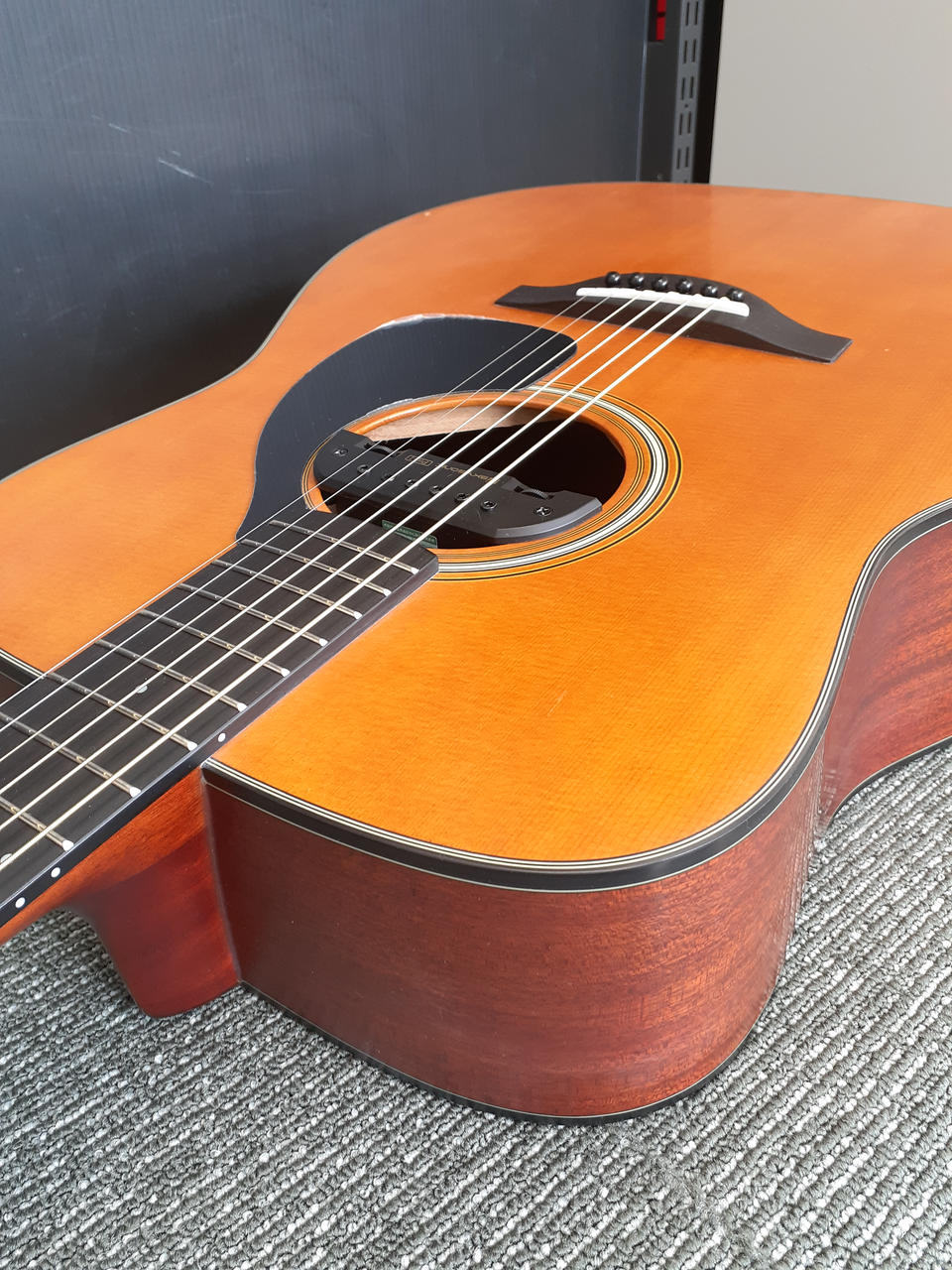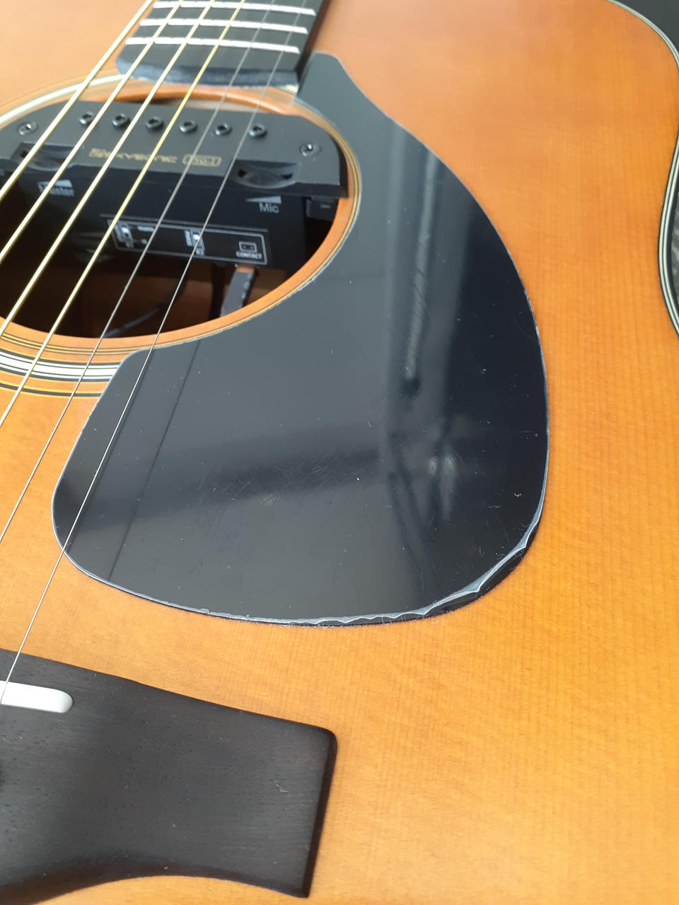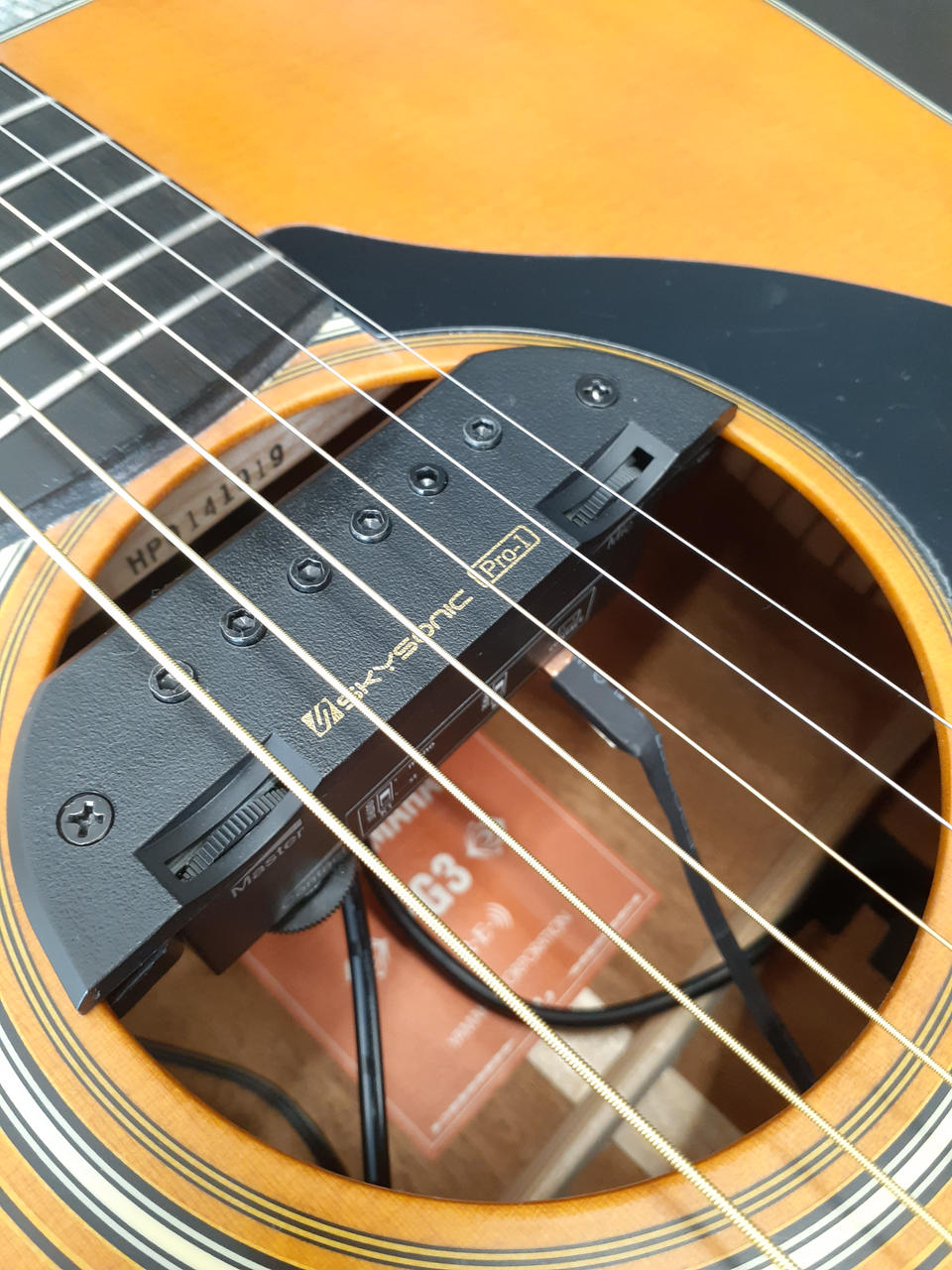「SKYSONIC PRO-1 3WAY SOUND HOLE PICKUP」が取り付けられています。マグ、マイク、コンタクトを組み合わせてナチュラルな出音を実現するピックアップです。 |