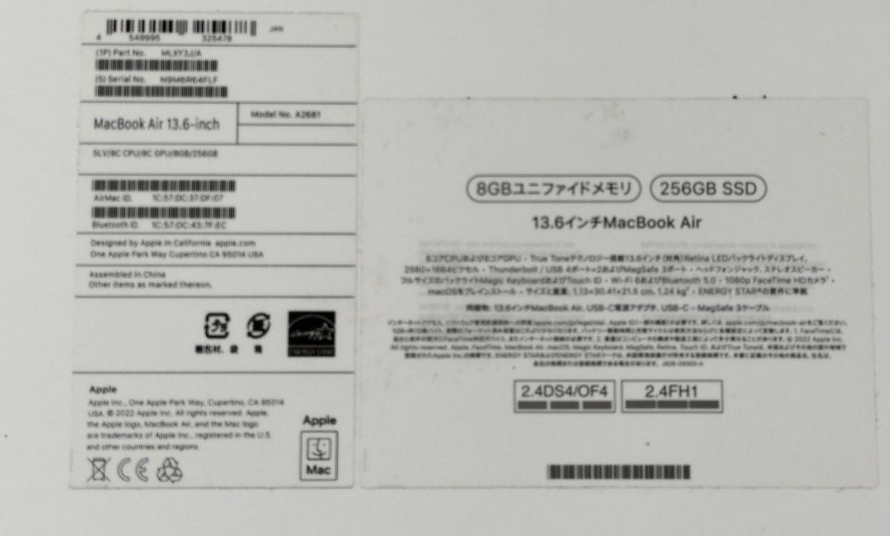 13.6インチLiquid Retinaディスプレイ Thunderbolt/USB4Type-CMagSafe /無線LAN/Bluetooth/Webカメラ/TouchID |