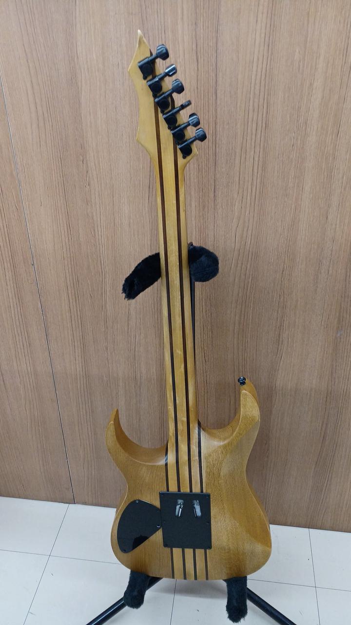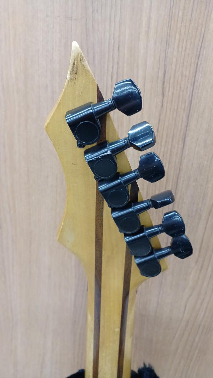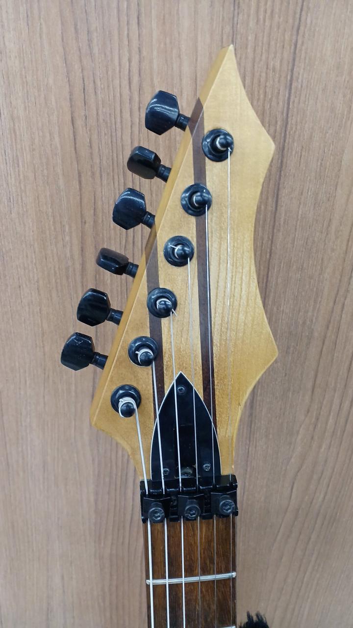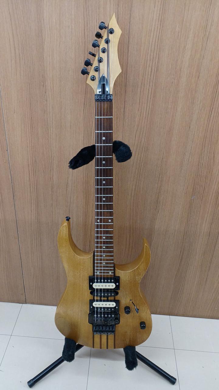 詳細不明ですが・・・自作なのかメーカー製なのか判断に迷う出来栄えタケウチ製のフロイドローズ搭載。しかも、スルーネック! さらに、ダンカン製のピックアップを、H-S-H構造で搭載した攻撃的な1本 |