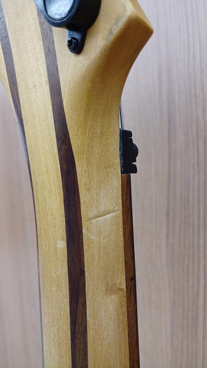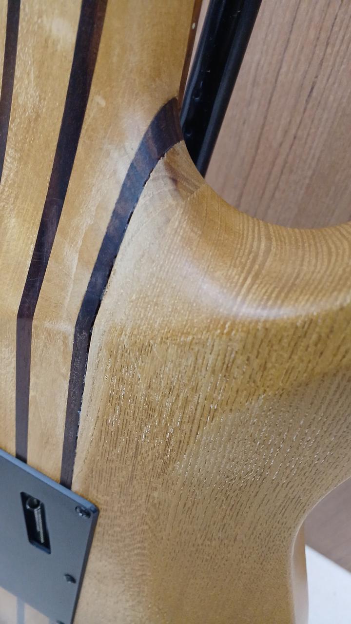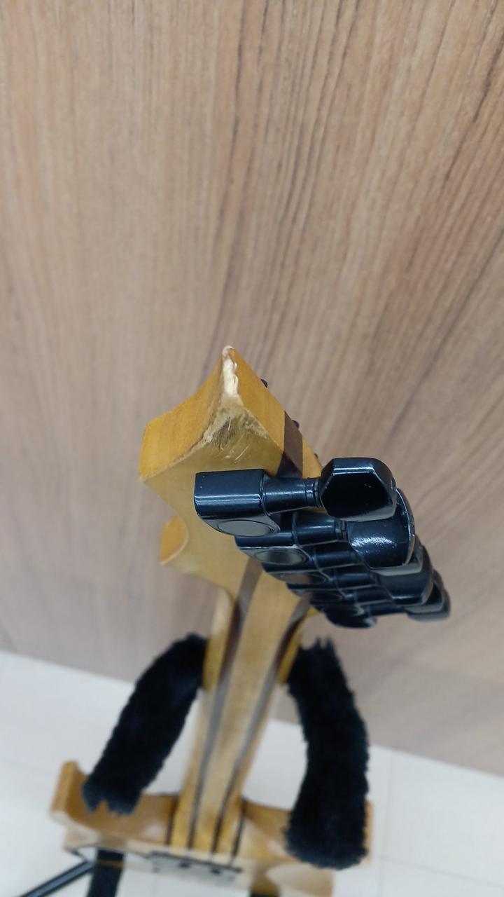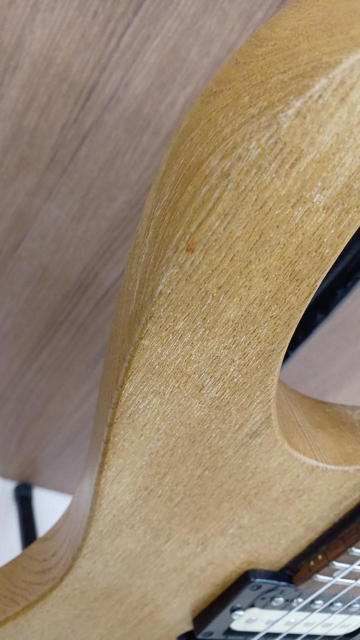 詳細不明ですが・・・自作なのかメーカー製なのか判断に迷う出来栄えタケウチ製のフロイドローズ搭載。しかも、スルーネック! さらに、ダンカン製のピックアップを、H-S-H構造で搭載した攻撃的な1本 |