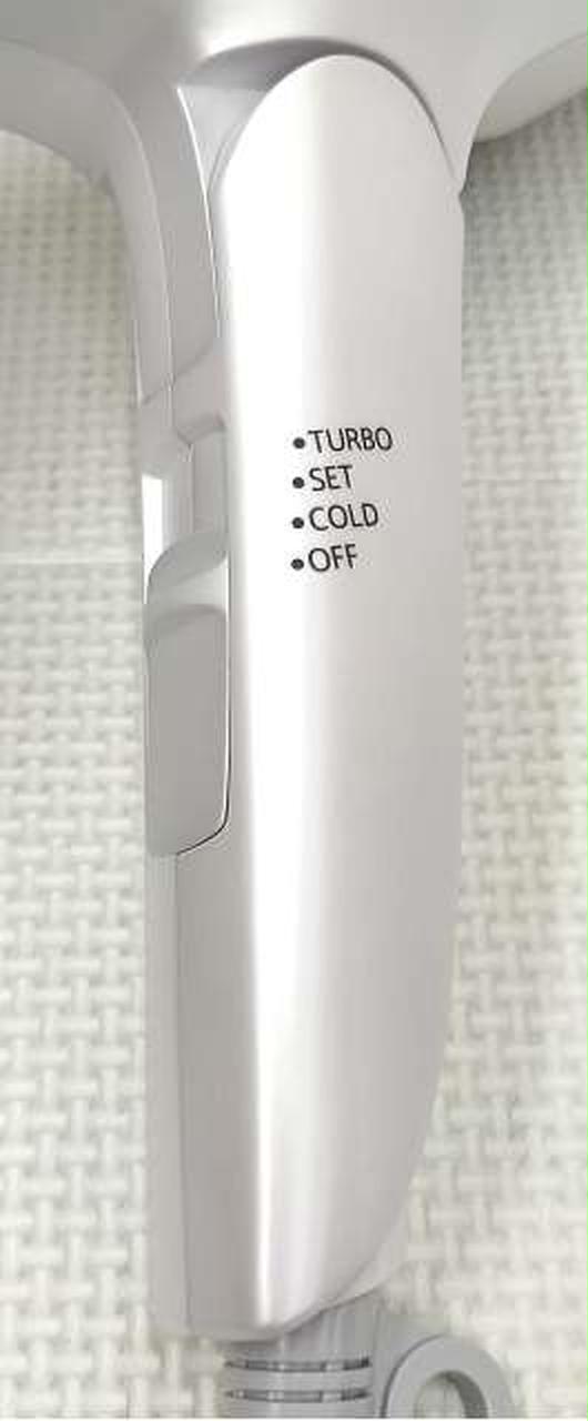 【メニュー】 快適なヘアドライのために、3種のメニューから選べる風パターンを搭載。切り換えもカンタンで、ハンドル部にあるメインスイッチをスライドするだけでOKです / TURBO:洗髪後は、まずはTURBO運転でヘアドライ。大量の速い温風で、髪を根元から乾かします / SET:髪が乾き始めたら、穏やかな温風が吹き出るSET運転で髪を整えます / COLD:仕上げは冷風が吹き出るCOLD運転で。キューティクルを引き締めてスタイリングした髪を長持ちさせる効果があり、うるおいを感じる仕上がりになります。 |