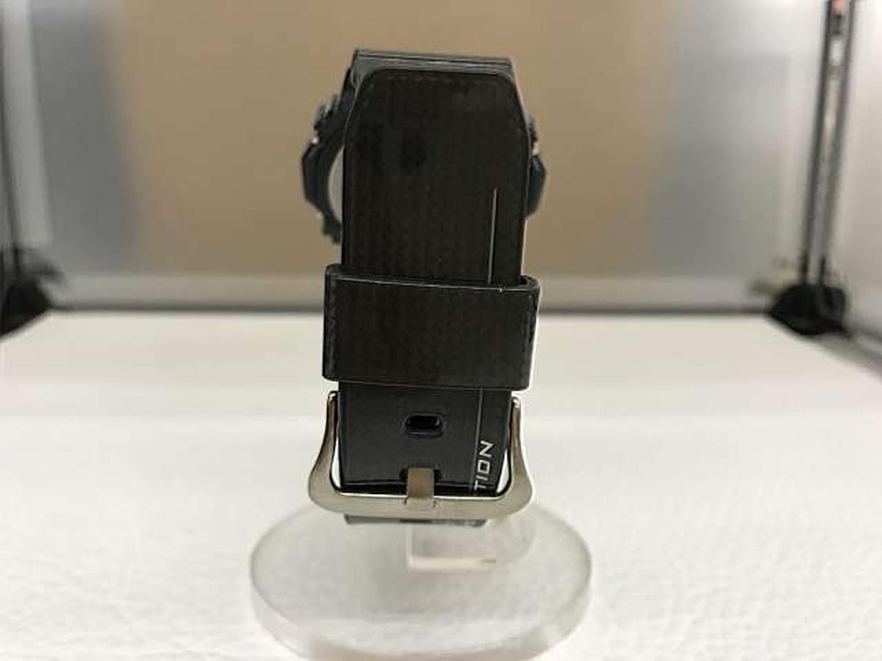 素材(Material)の面で、衝撃に耐える(Resist)性能を追求した「RM Series」です。ミズノテクニクス株式会社との共同開発により、引張耐久力に優れるカーボンファイバーを樹脂にインサートすることで切れにくい強靭なバンドが実現。ケース結合部分のばね棒周り、美錠周り、遊環などにまでカーボンファイバーをインサートし、細部にまで配慮しました。裏蓋やサイドボタン、美錠などのメタルパーツにはチタンを採用。裏蓋は鍛造加工を行い、耐衝撃性・耐久性を追求しています。デザインは、カーボンファイバーの風合いを活かしてクールに仕上げています。 |