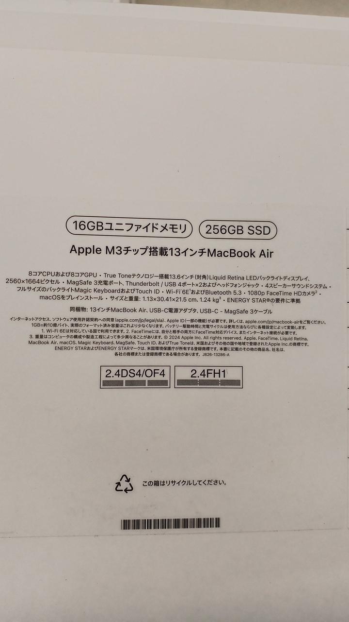メモリ:16GB/SSD:256GB/OS:15.4.1 Sequoia/※オフィスは非搭載 |