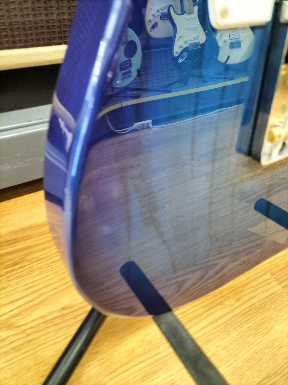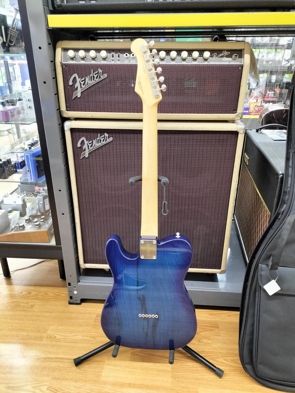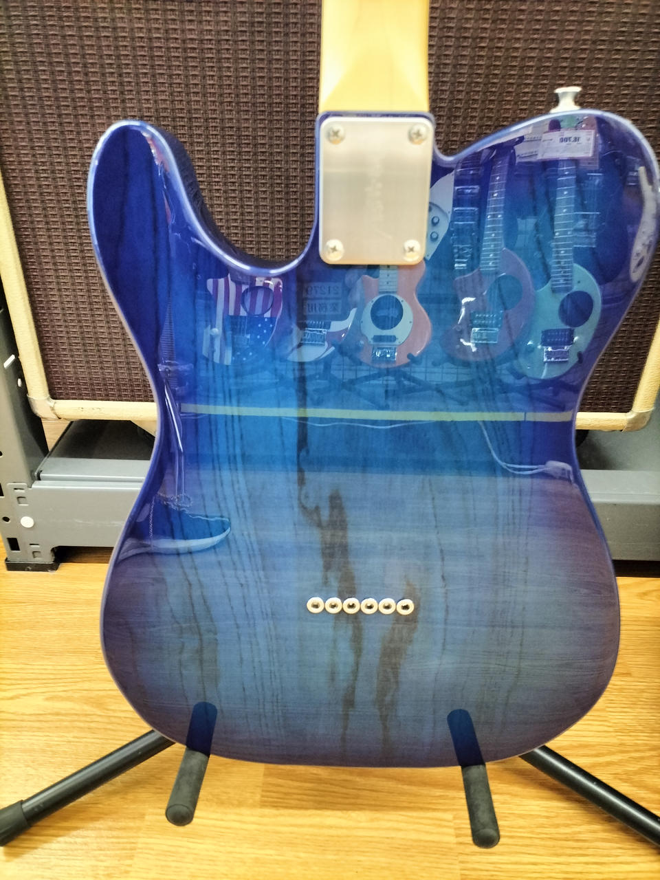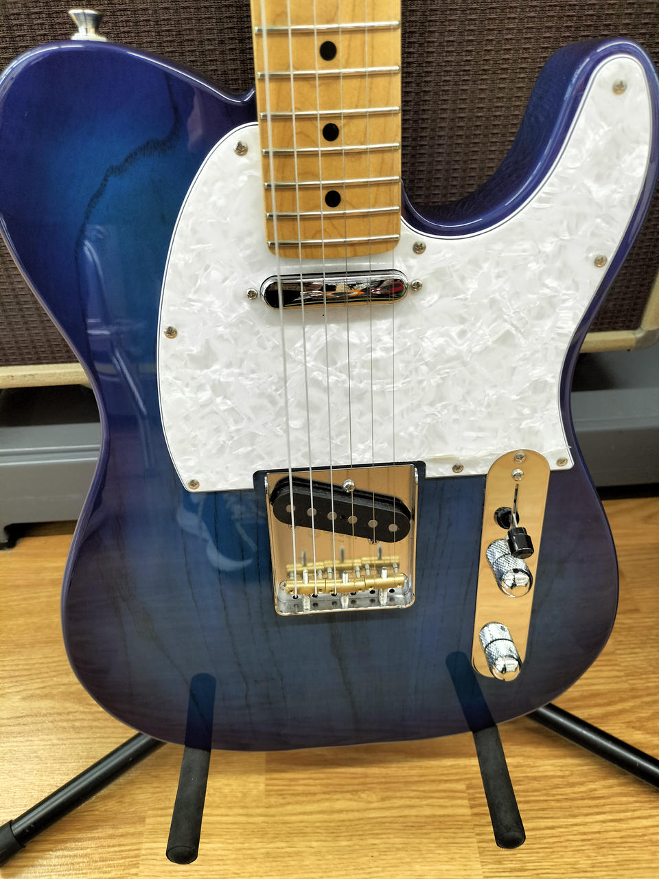 アッシュボディ、メイプル指板にシースルーブルーバーストカラーが映える一本です |