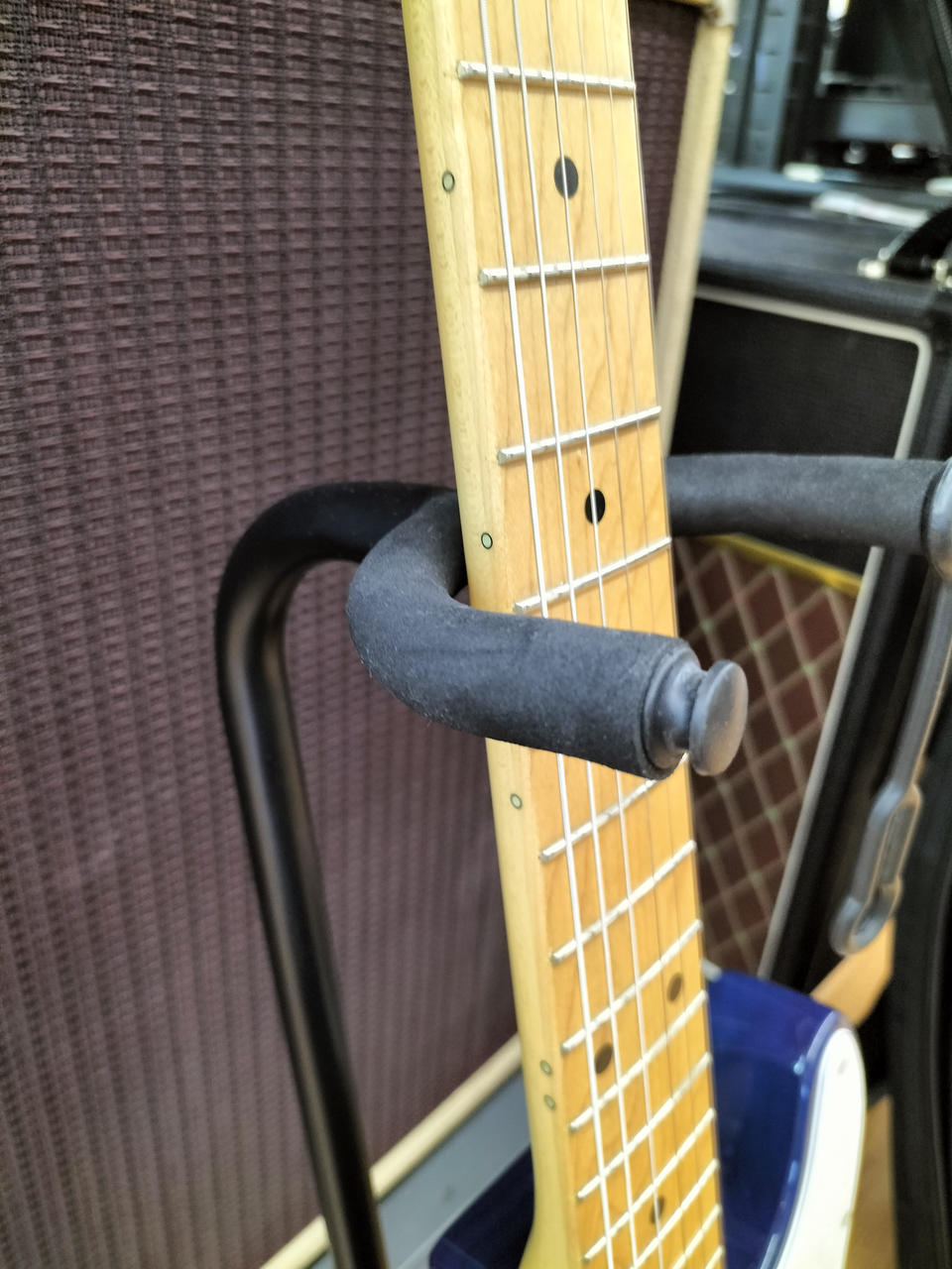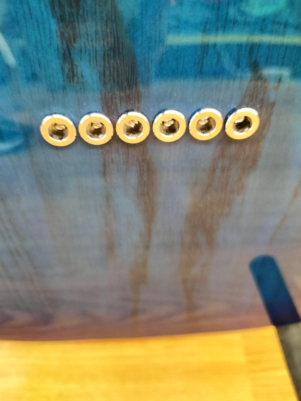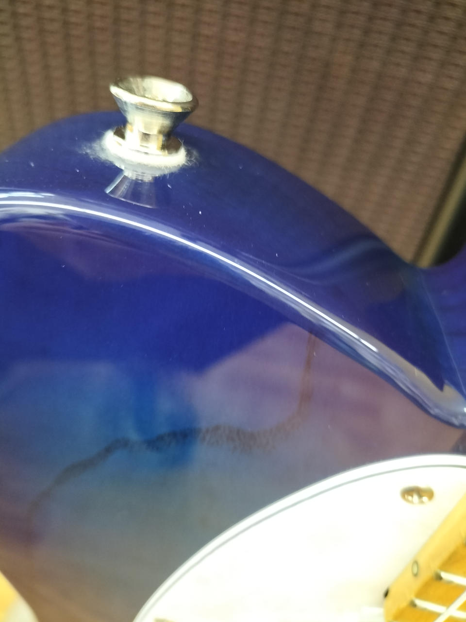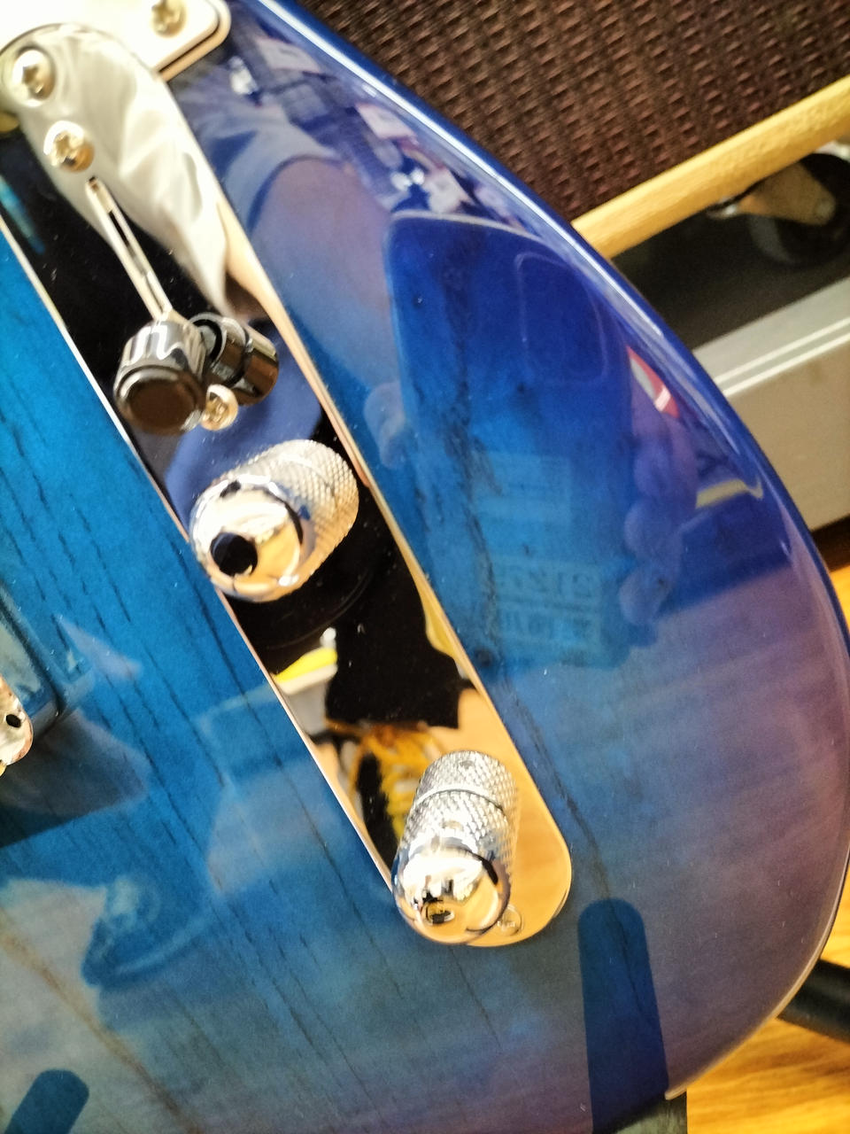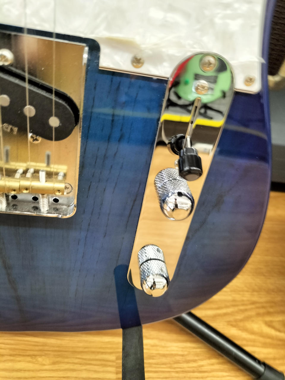 アッシュボディ、メイプル指板にシースルーブルーバーストカラーが映える一本です |