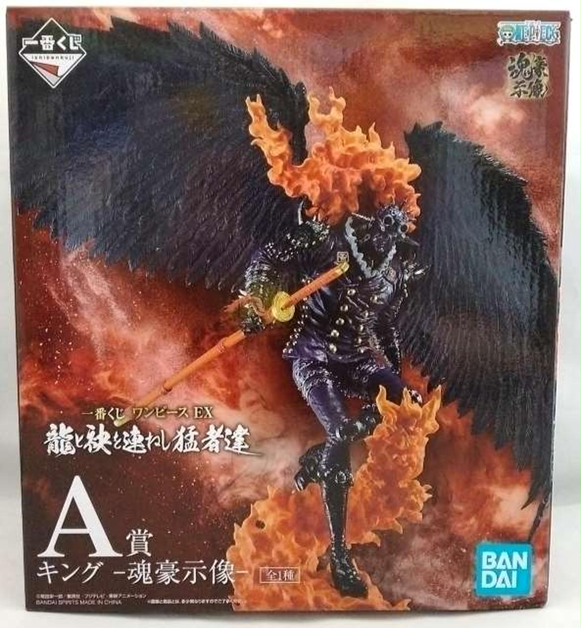 百獣海賊団の大看板「火災のキング」が、「魂豪示像」から圧倒的クオリティで立体化。大きく広げた翼と荒々しい炎のエフェクトの力強さ。そして、翼の羽1枚1枚から、本体の細かな装飾品に至るまで、こだわりぬいた繊細な作り込み。力強さと繊細さをあわせもつ、魂のこもった逸品。