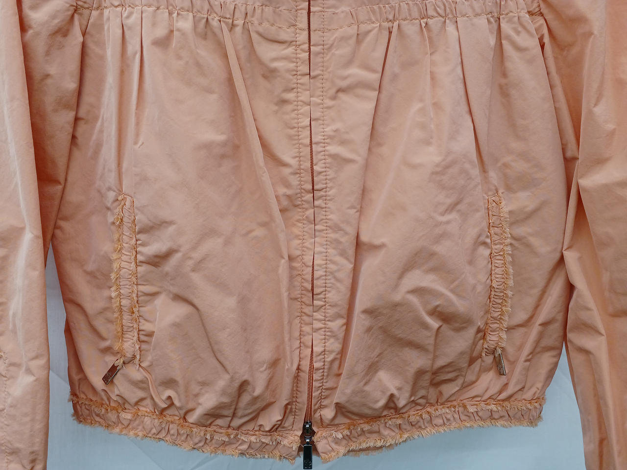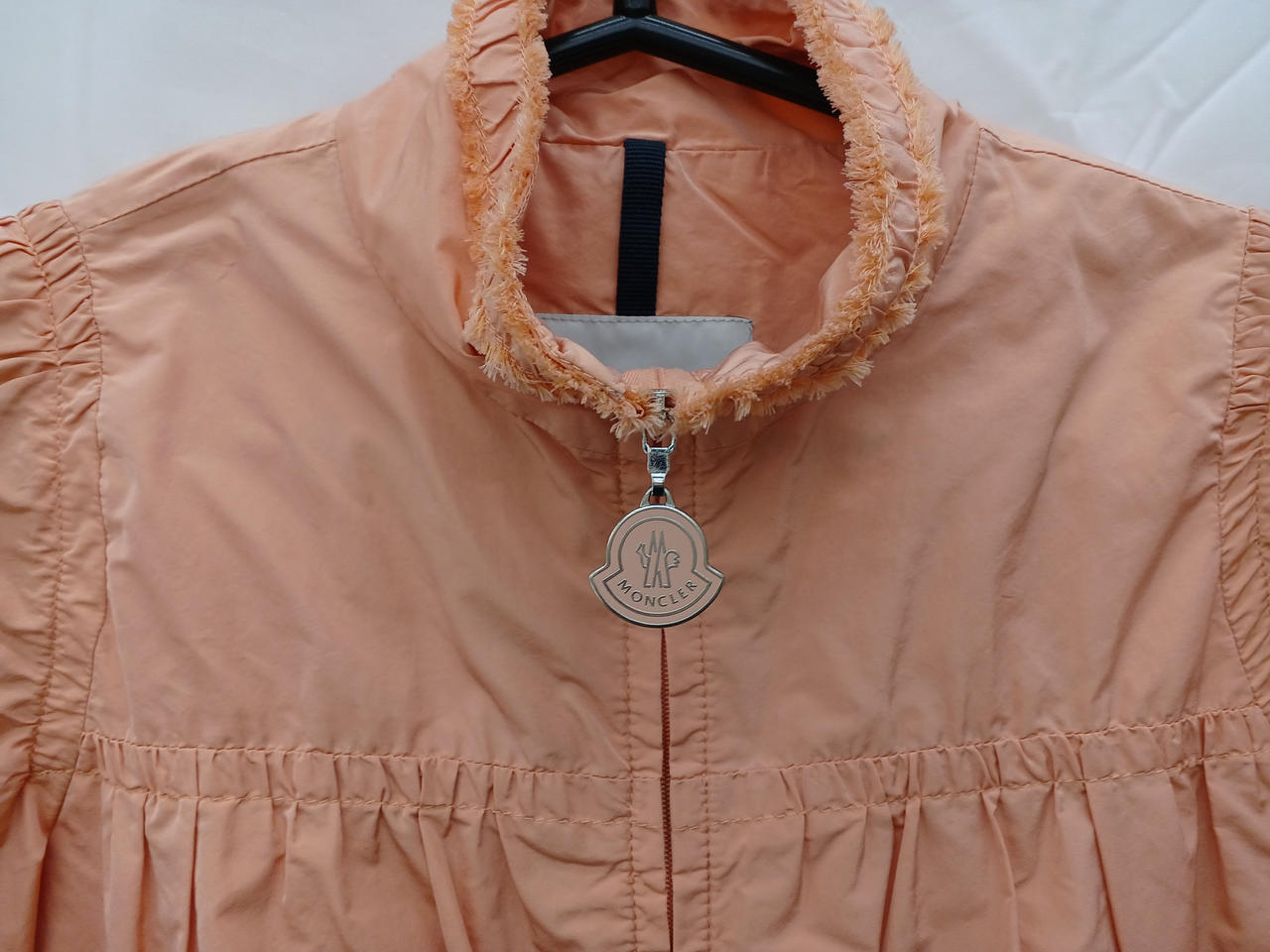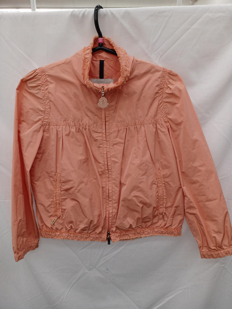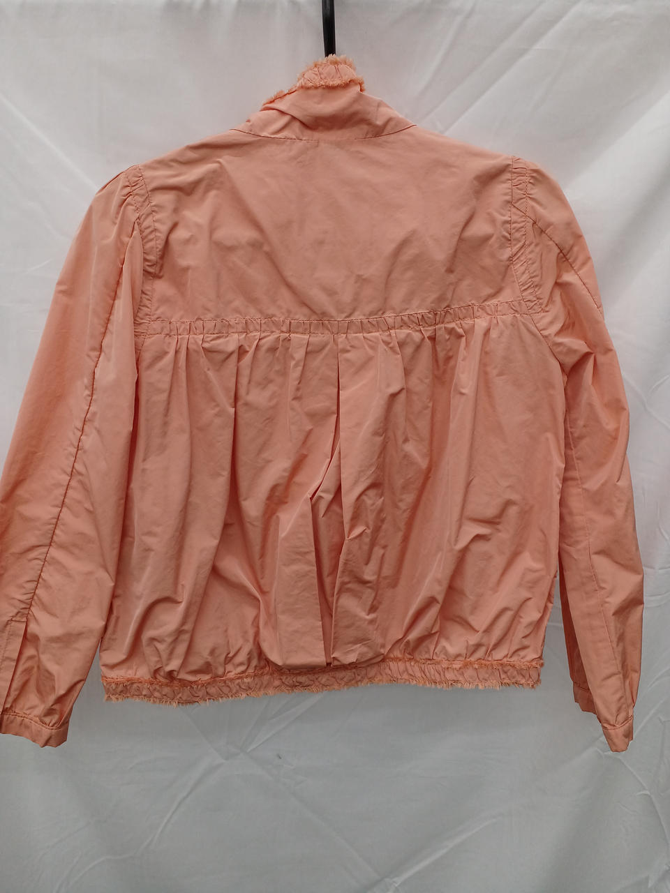サーモンピンクのノーカラーフリルジャケットです |