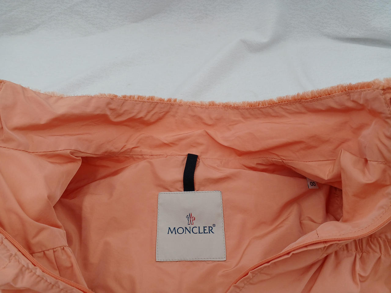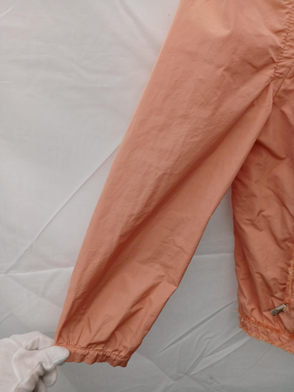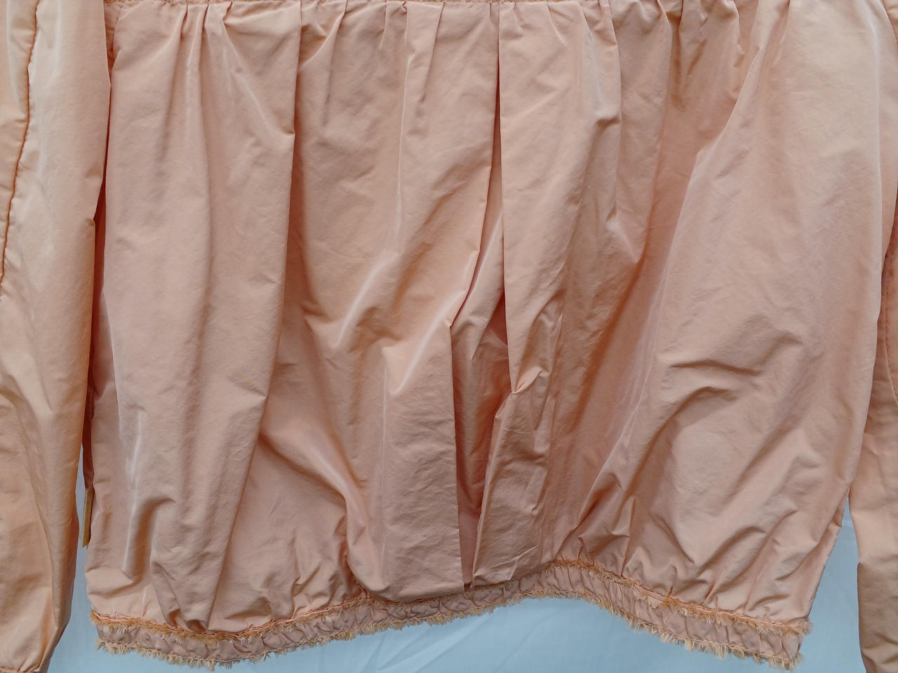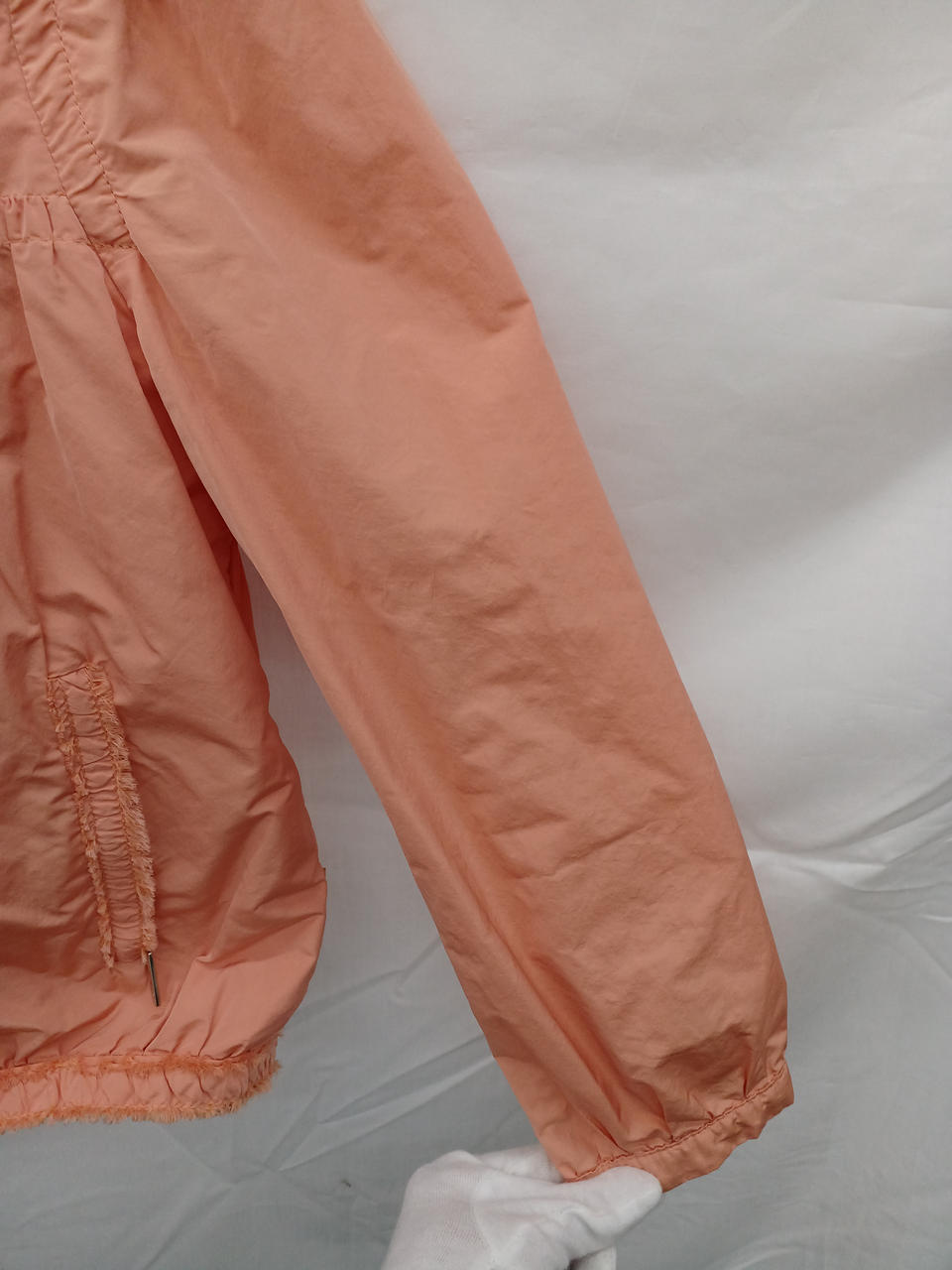 サーモンピンクのノーカラーフリルジャケットです |