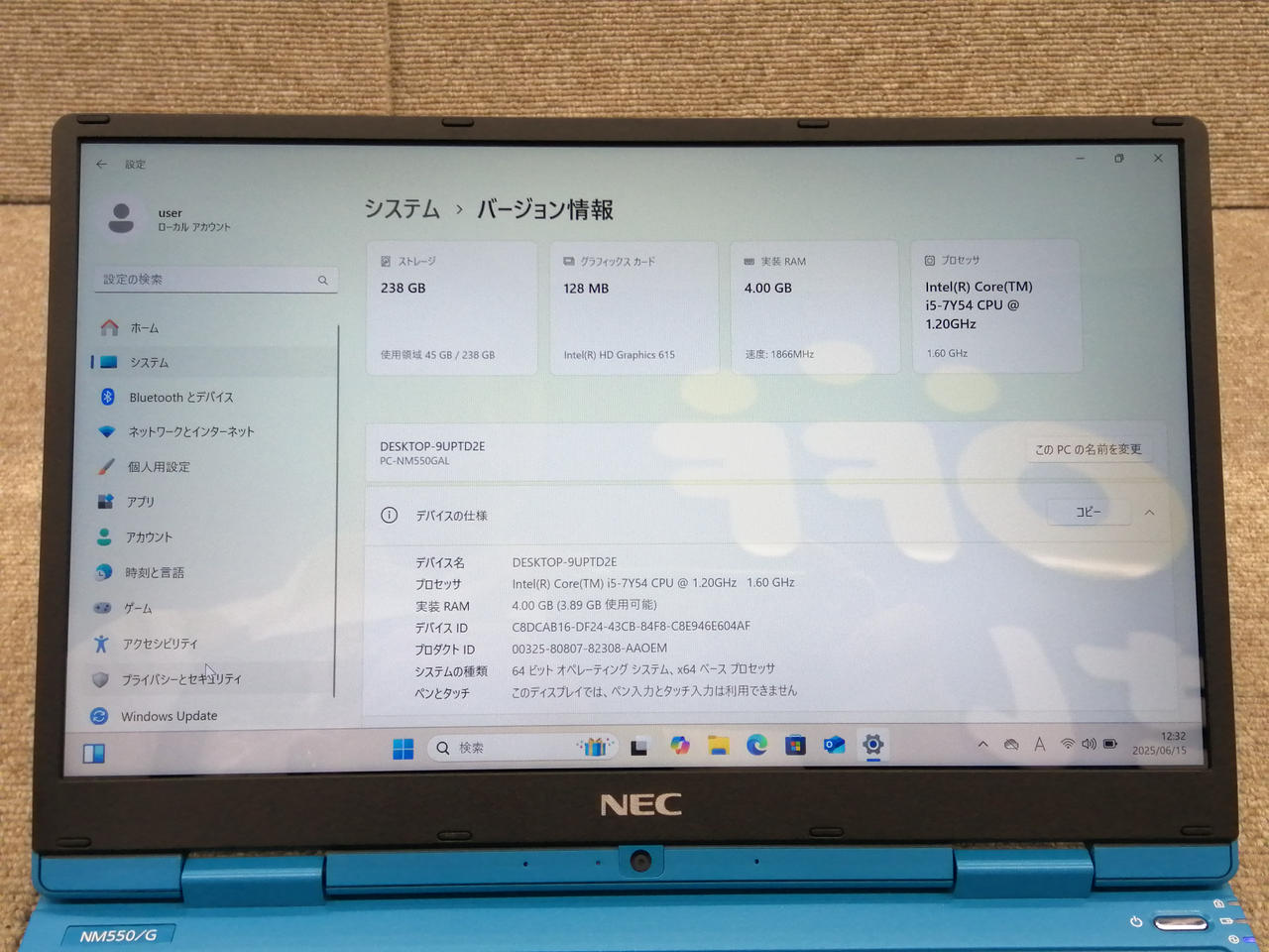 RAM:4.0GB ストレージ:240GB SSD GPU:Intel HD Graphics 615 |