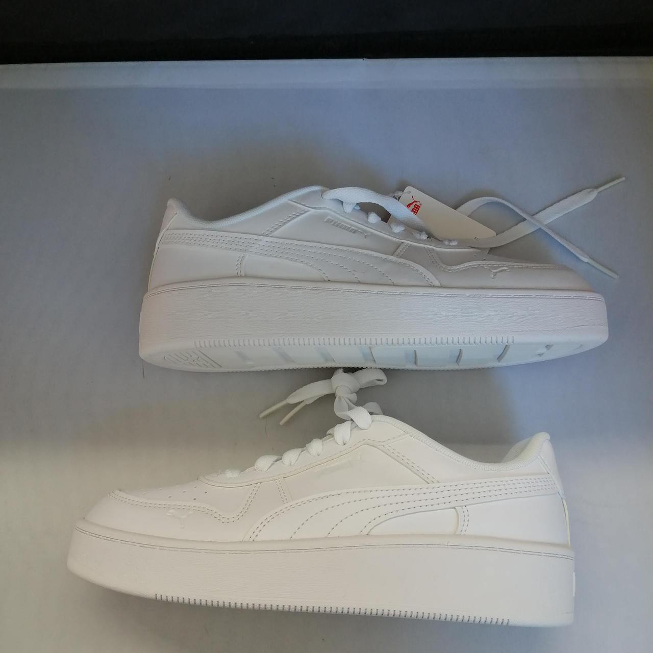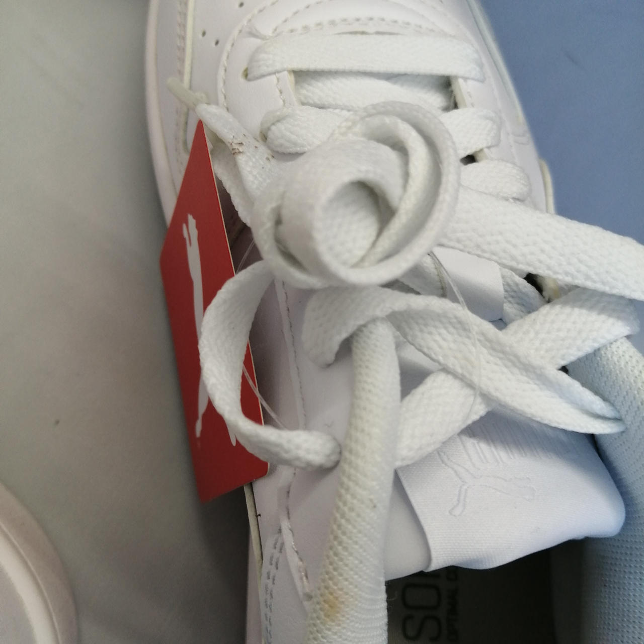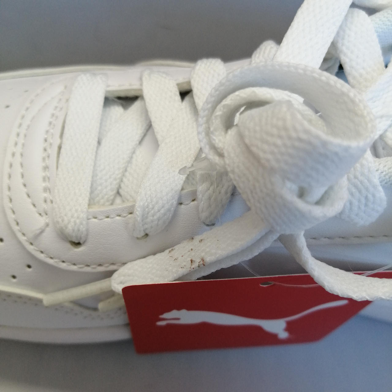 未使用品ですが右足履き口左上に5mm程度のシミと、右紐一部ベタつきがあります。 |