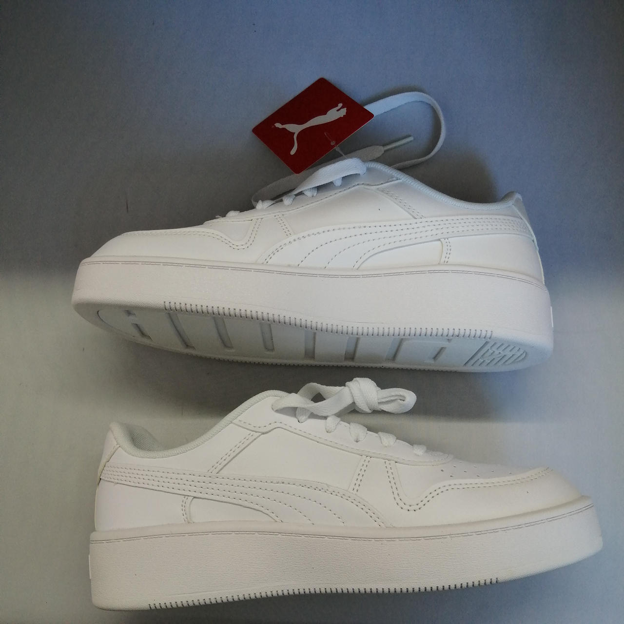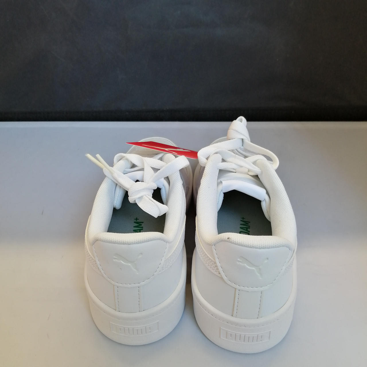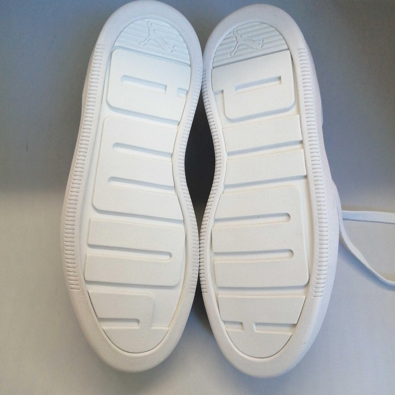 未使用品ですが右足履き口左上に5mm程度のシミと、右紐一部ベタつきがあります。 |