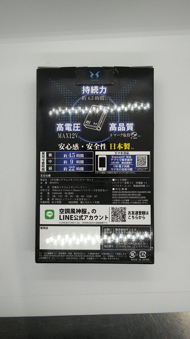 最大出力で約4.5時間稼働できる、空調服用の12V仕様のリチウムイオンバッテリーです!