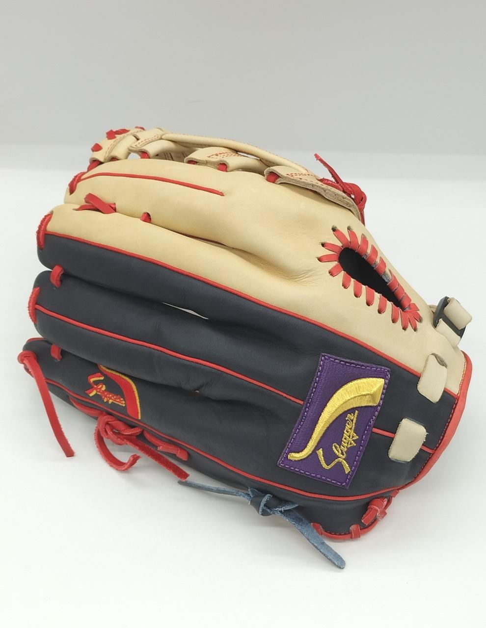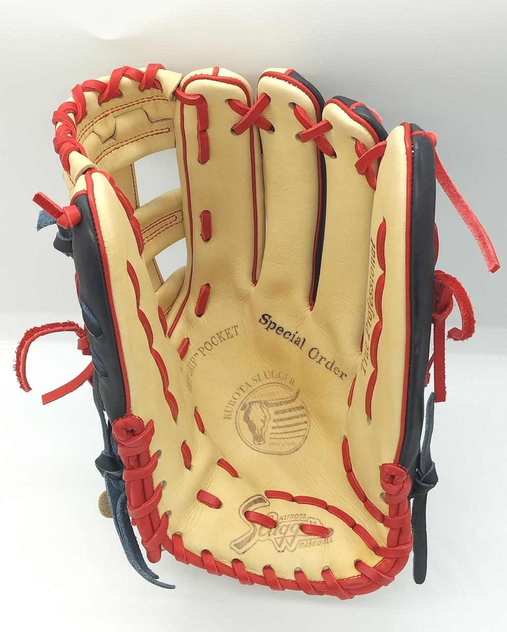 ブラックとトレンチの2トーンカラーにレッドのレースが映える久保田スラッガーのグラブです✨