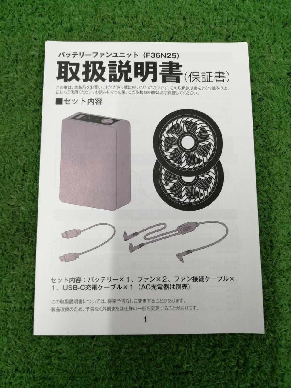 作業服 ・ファン×2 ・ケーブル ・充電ケーブル(AC充電器は別途用意してください) |
