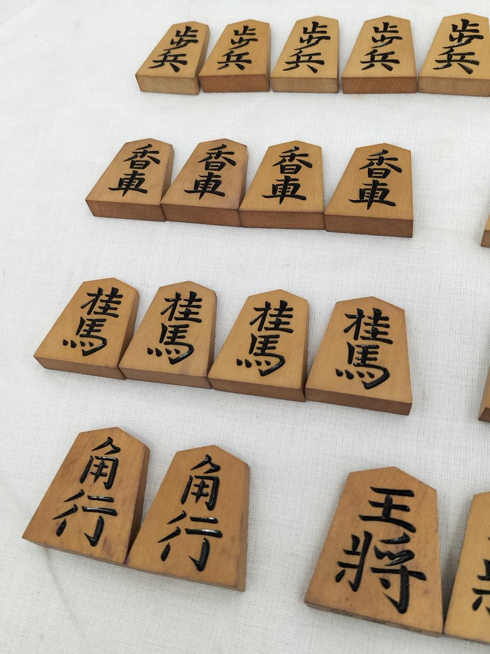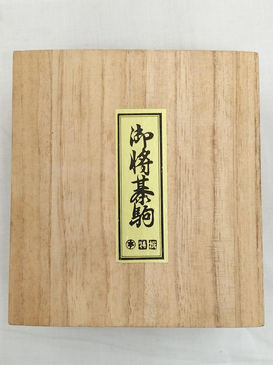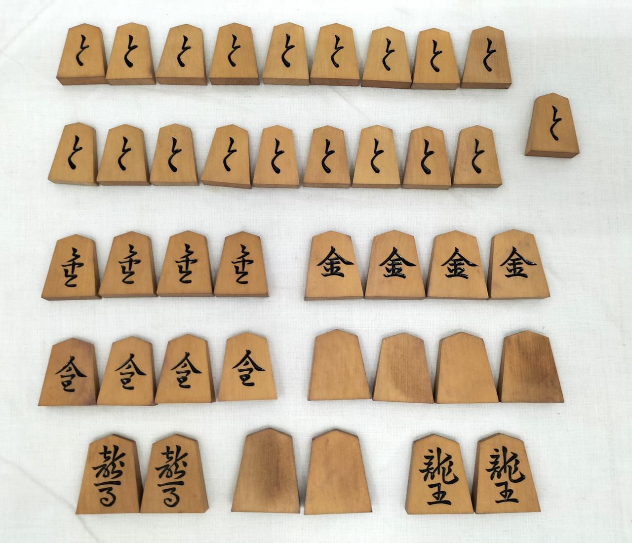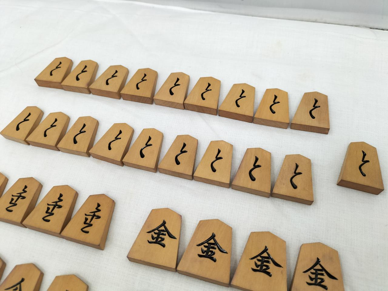 箱の内側、紫色に汚れています。(恐らくは布地からの色移り?)駒は経年感ありますが、対局できる個数は揃っています。