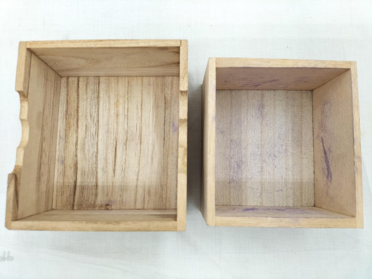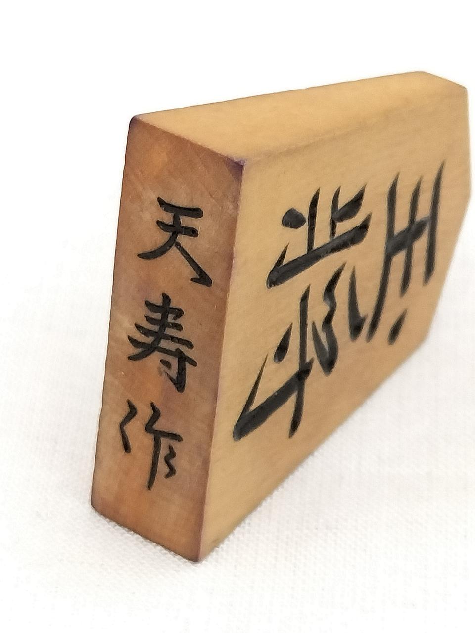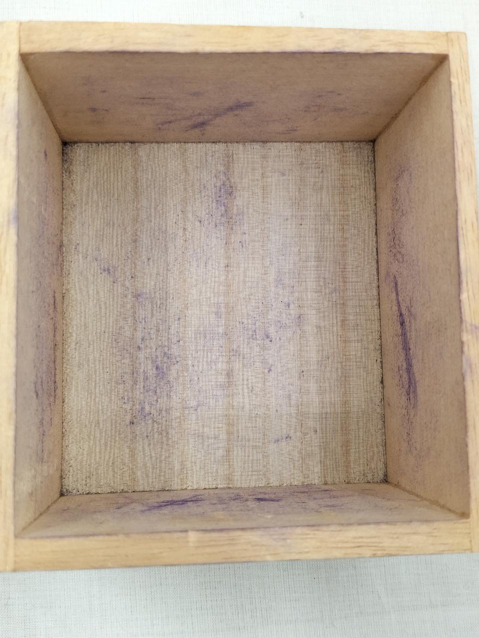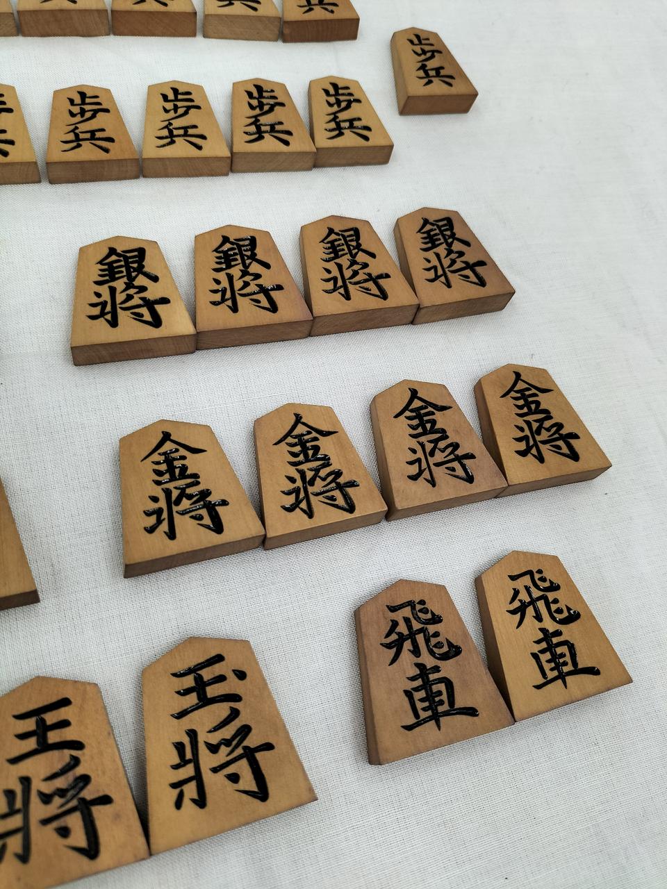 箱の内側、紫色に汚れています。(恐らくは布地からの色移り?)駒は経年感ありますが、対局できる個数は揃っています。