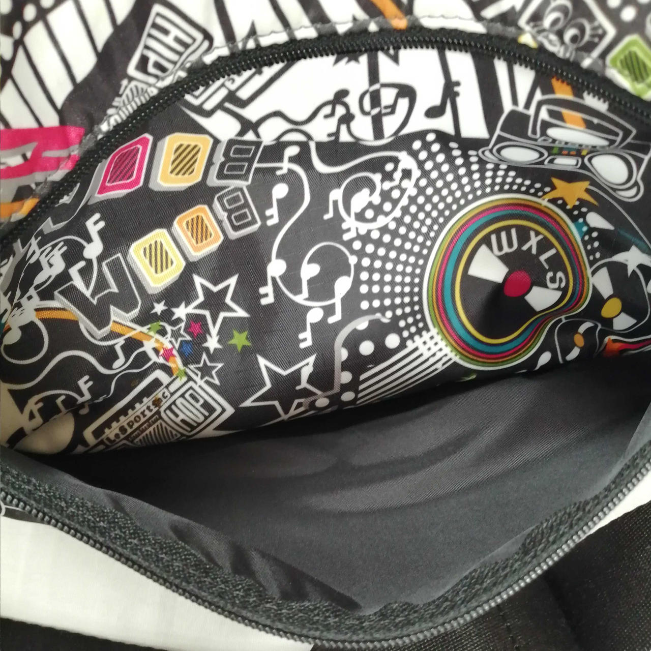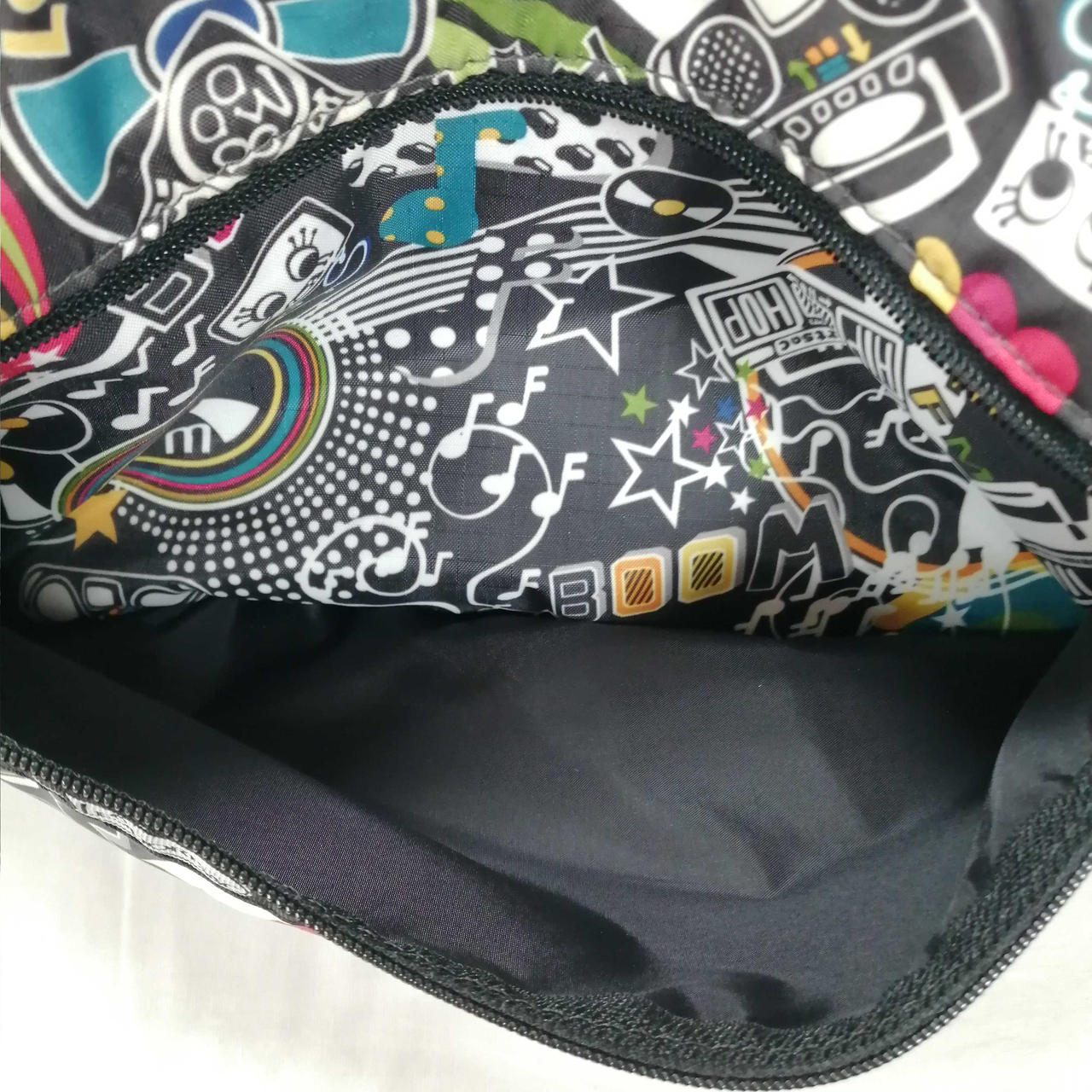 ブラックをベースにマルチカラーの柄がPOPなアイテムです!軽く折りたたんでの発送となります。