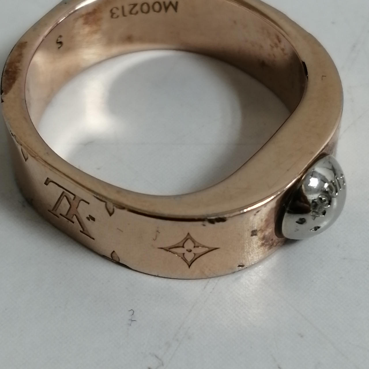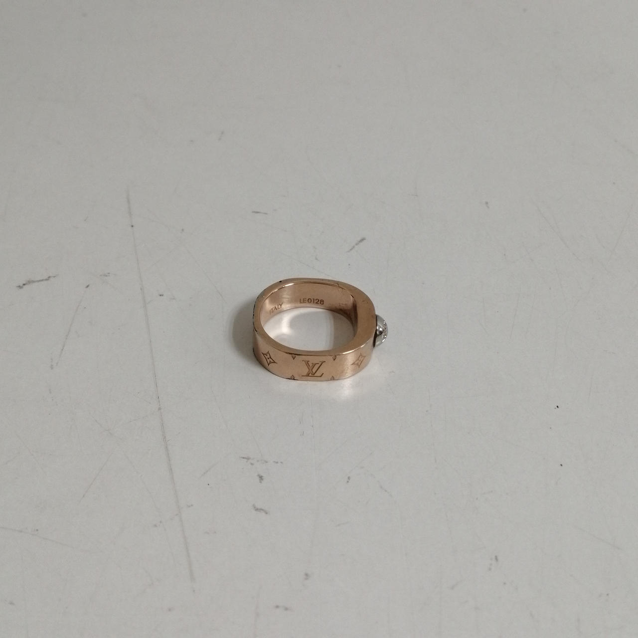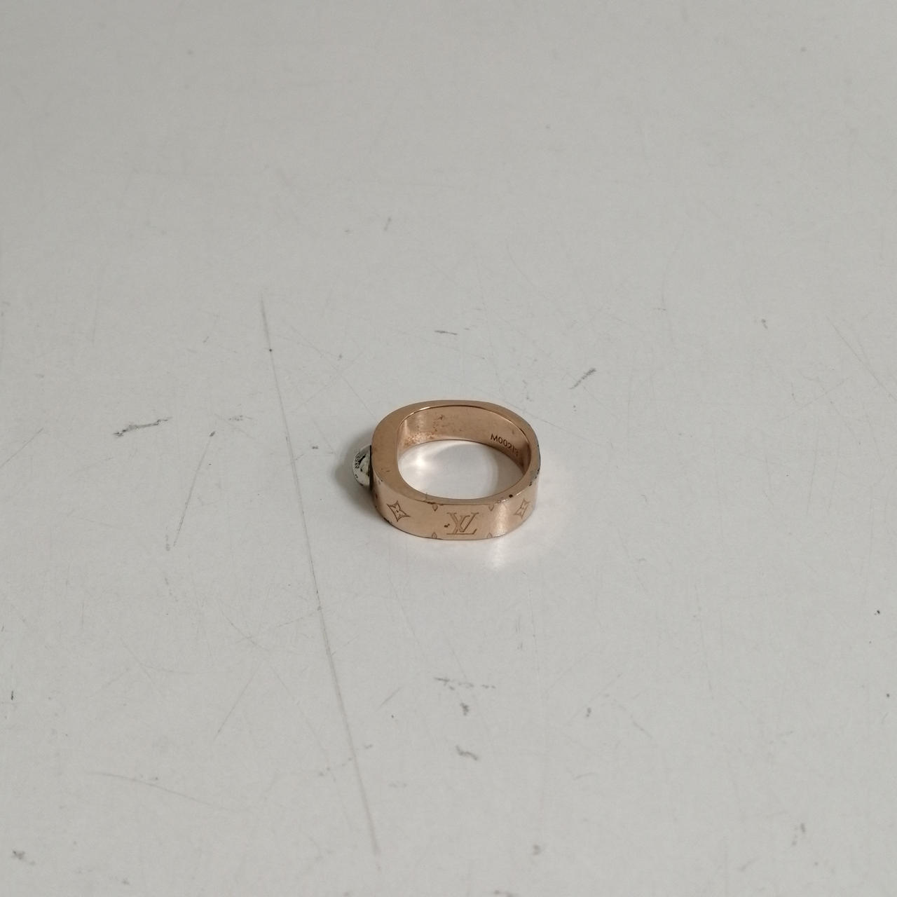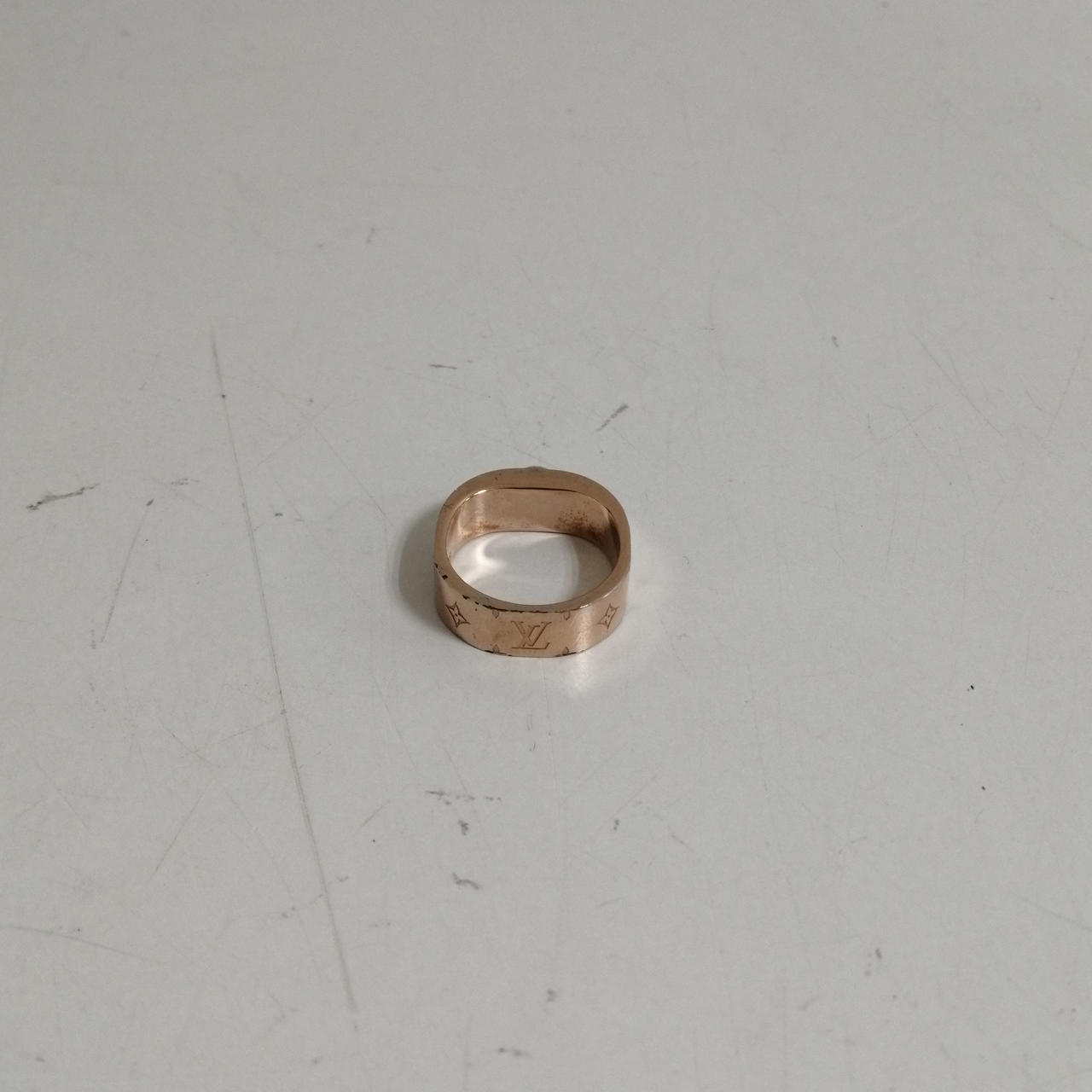 LOUIS VUITTON バーグナノグラムリング ピンクゴールド色。M00213 LE0128 所々くすみあり。左側の角にキズあり。内側多少のサビ。あくまでも中古品ですので画像をよくご参照ください。また店頭にて展示販売しておりますので状態が変化する場合がございます。ご了承くださいませ。 |