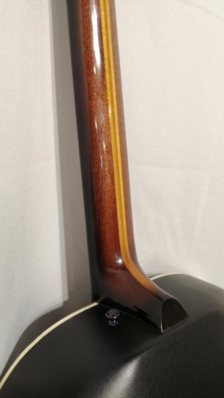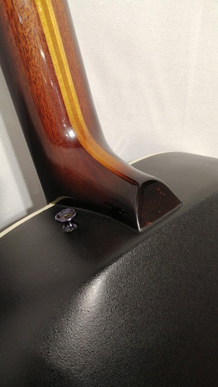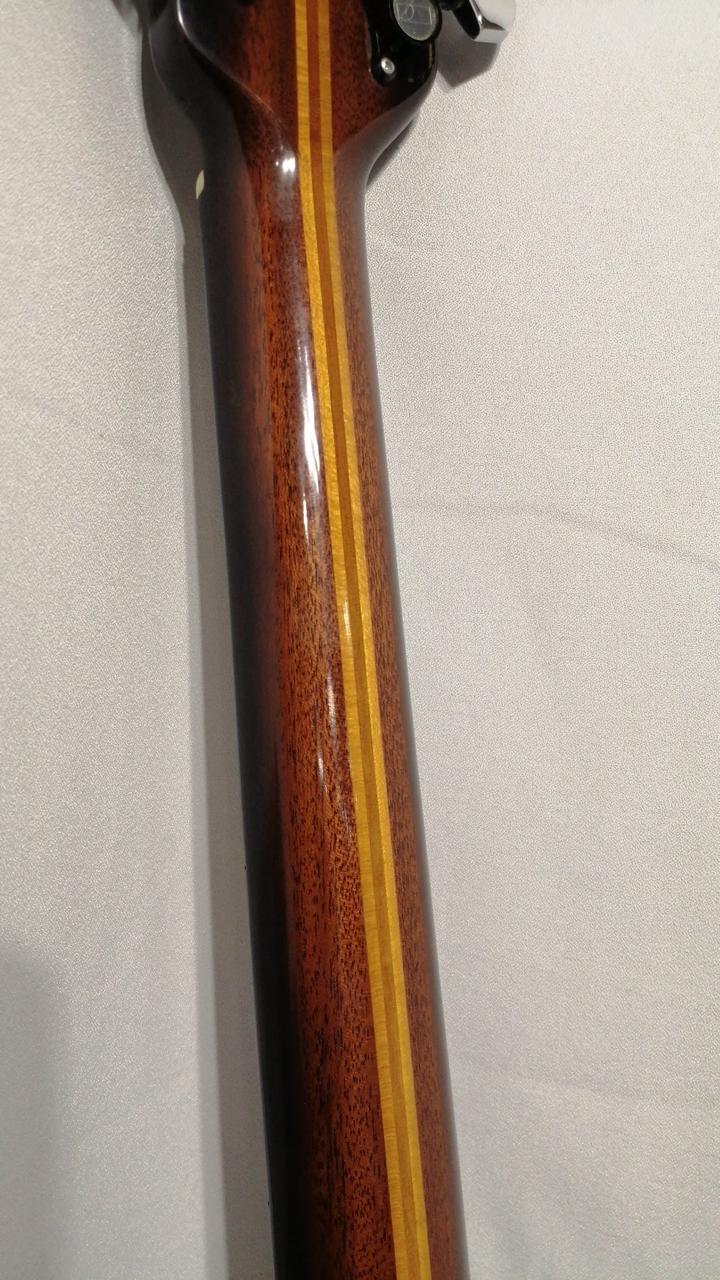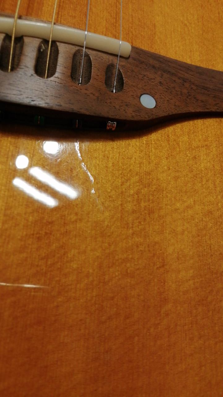 2弦ブリッジ付近に恐らく弦を引き抜く際にできたと思われる傷の補修痕があります。また、2弦ペグのビス止め部分片方(2か所のうち下側)に割れがあります。