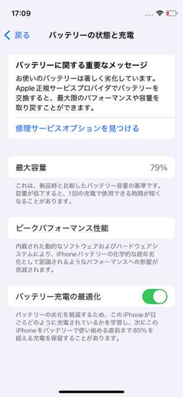 iOSバージョン:18.1 バッテリー最大容量79% |
