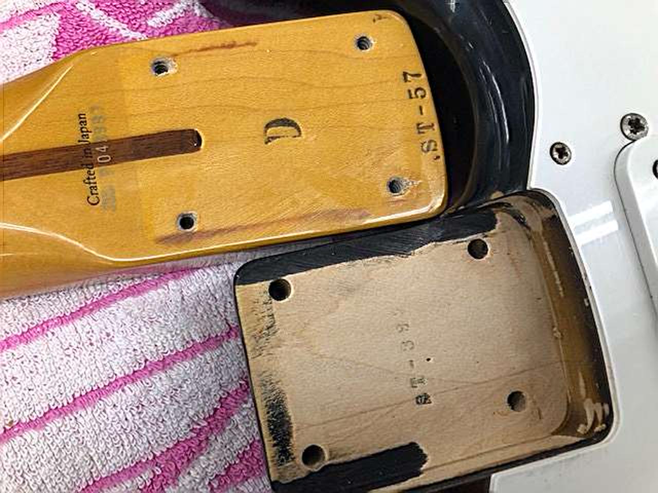 2025年4月当社指定業者にてメンテナンス済み(電気系統) シリアルより1999-2002年頃製造 USA製ピックアップ搭載 ダイナ楽器期のST57 |