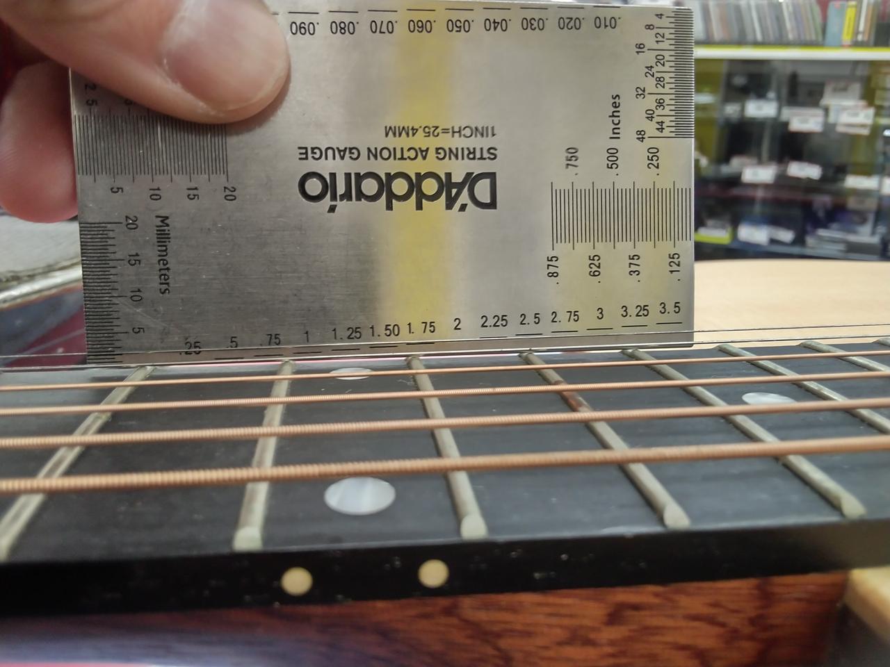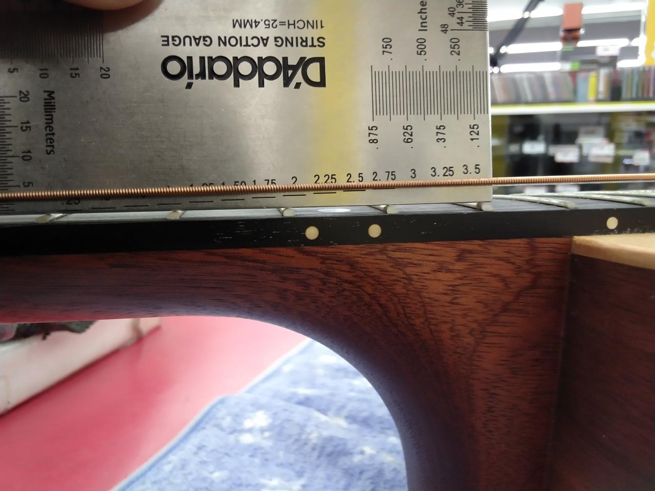 ※商品画像は、12-56の弦にて、レギュラーチューニングの状態で撮影しています。トラスロッドもレギュラーチューニングの状態を基準にしてあります。 全てのポジションで演奏確認を行い、音詰まりがないこと音が消えないことを基準にセッティングしています。弦高の数値は、気候・ネックコンディション・チューニング・弦のゲージの具合等の要因で上下しますので、あくまでの参考値となります。 |