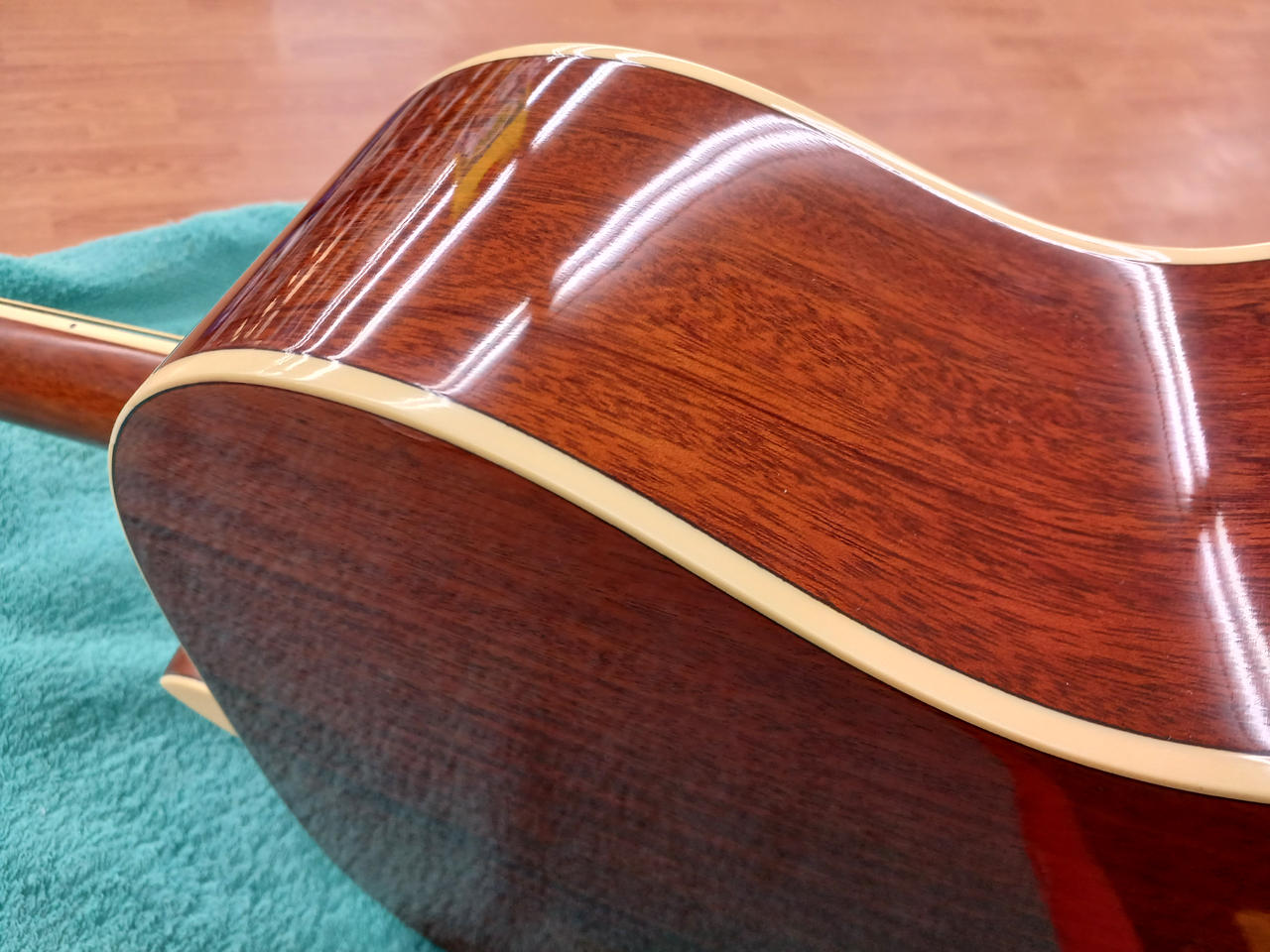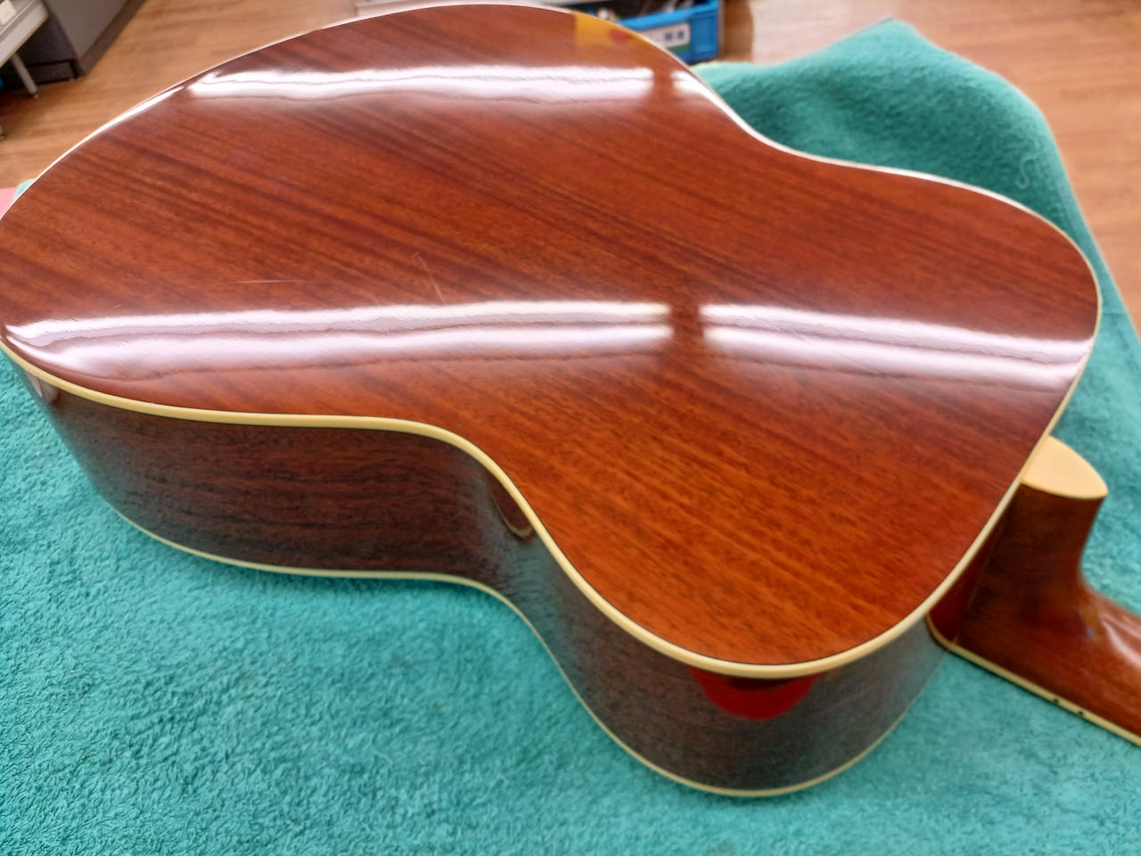 表板はスプルース単板、裏・側板にマホガニーを採用。
