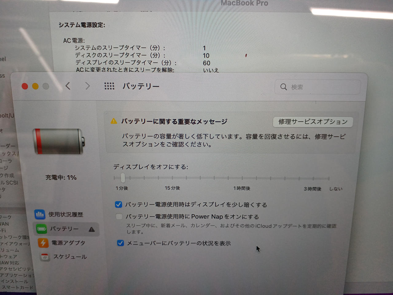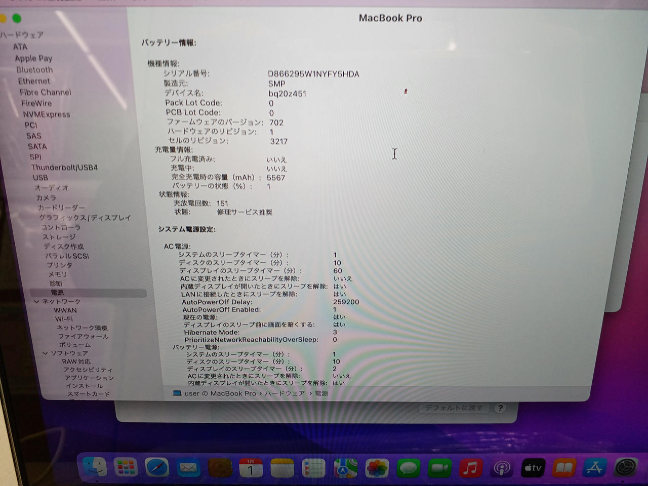充放電回数:151、パスワード「0000」、バッテリー修理サービス推奨になっています |