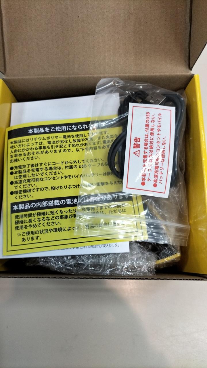 外箱、説明書、接続ケーブル、充電ケーブル付属。 |