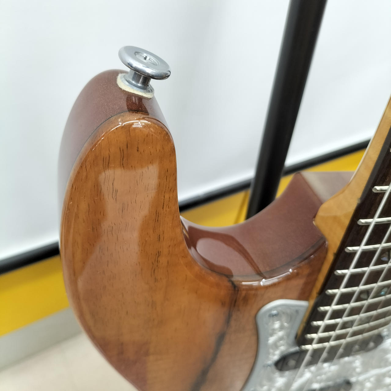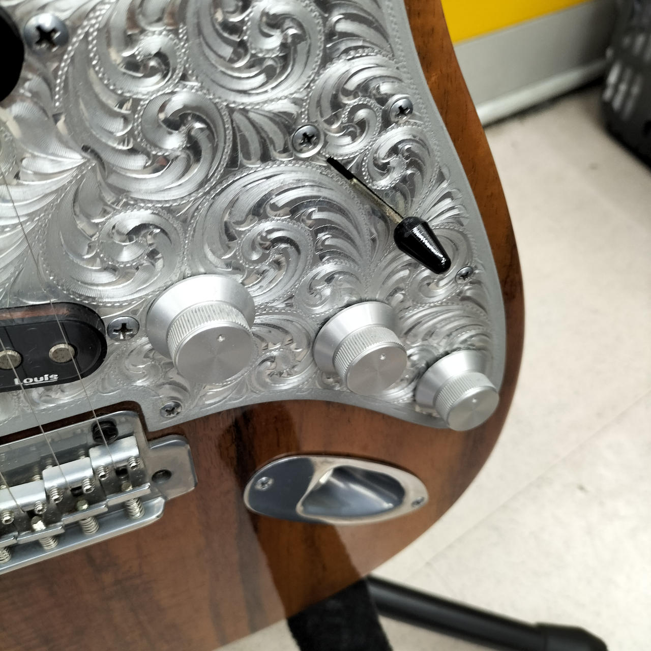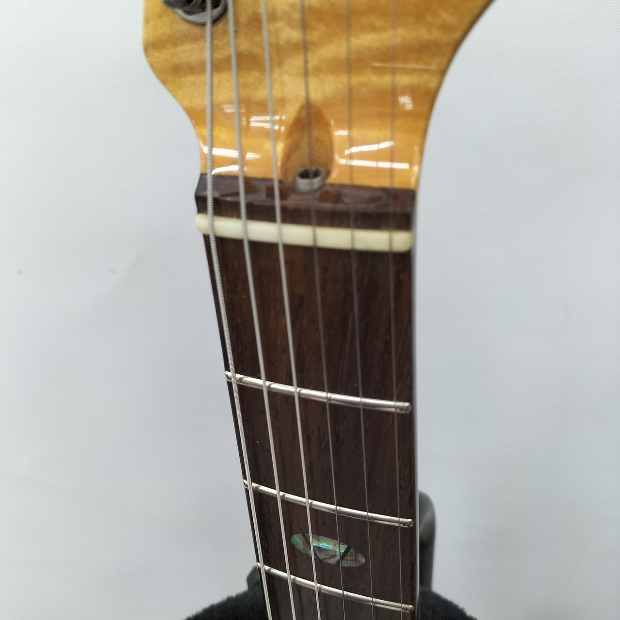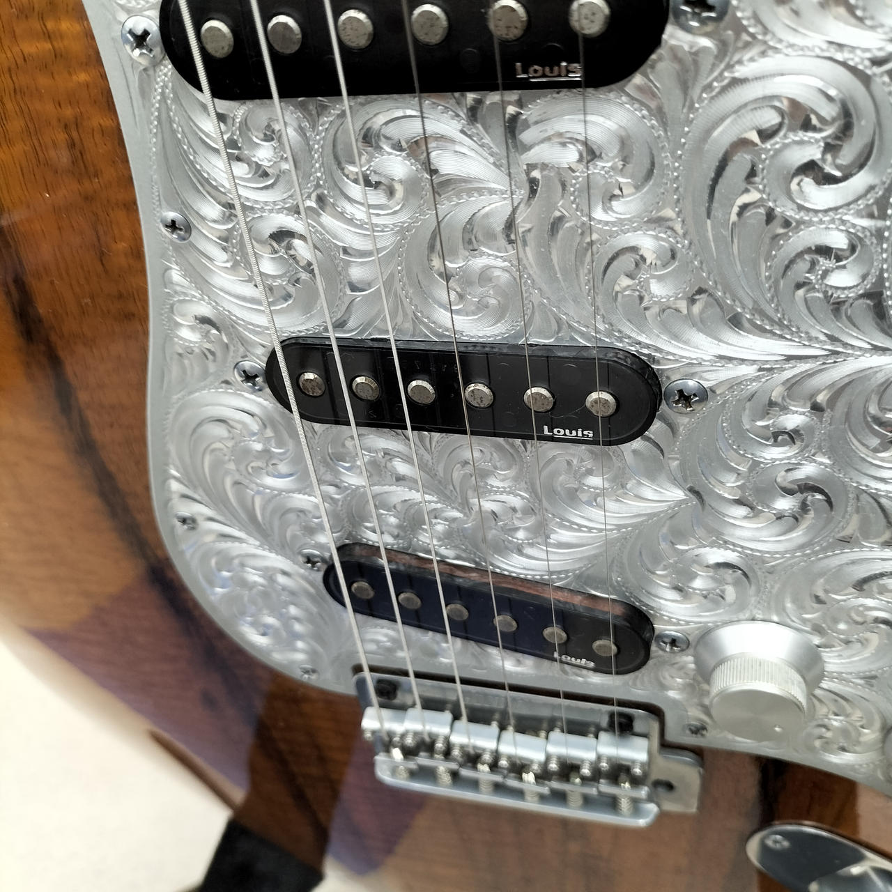 美しい木目と、精緻なハンドメイド彫金ピックガードがひときわ目を引くギターです!! |