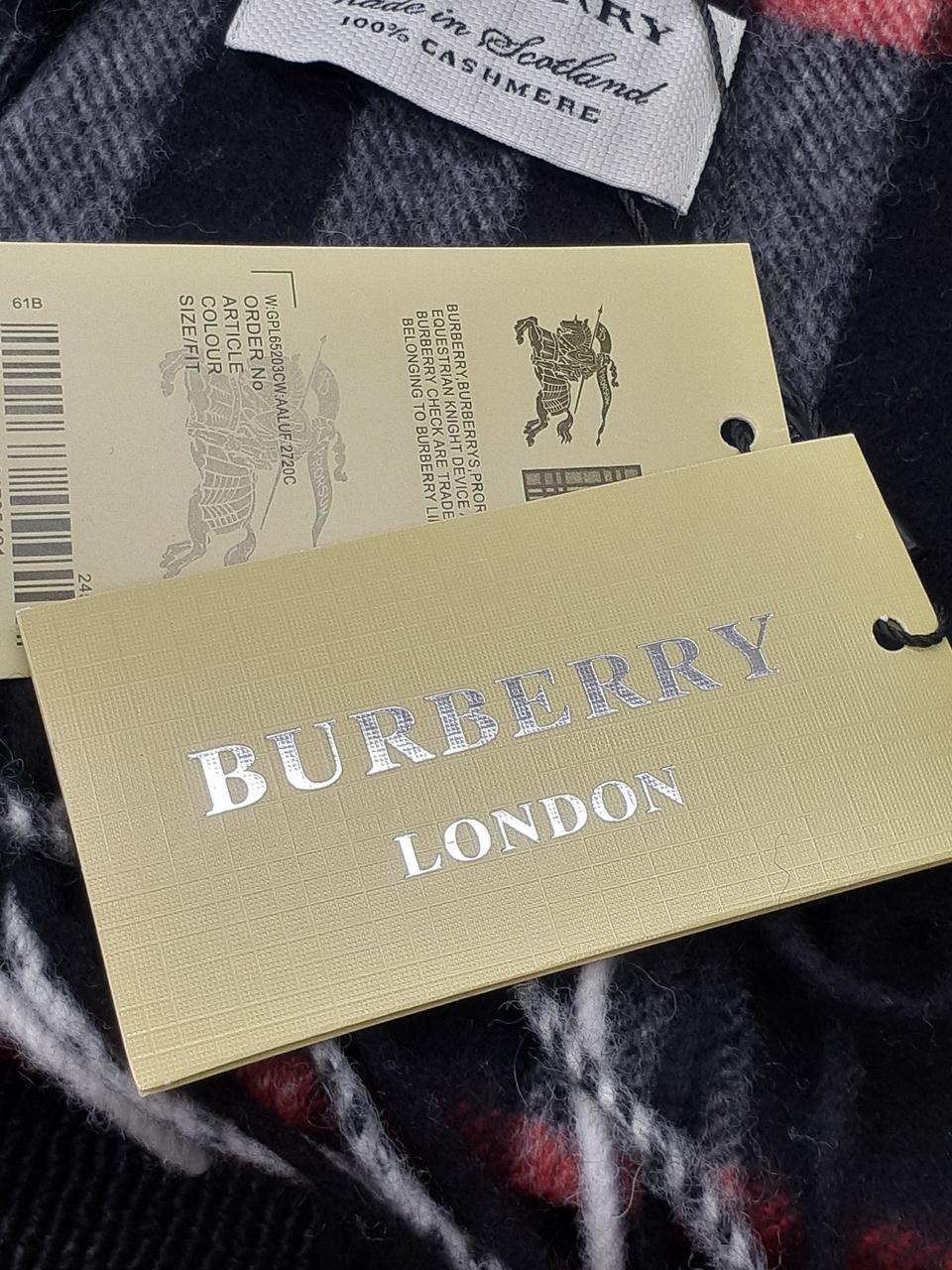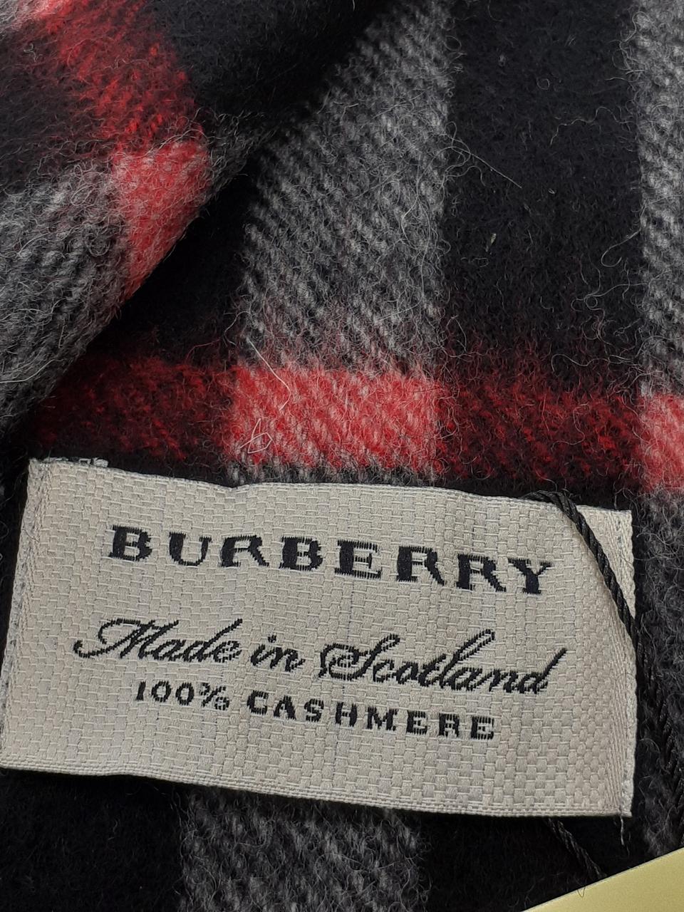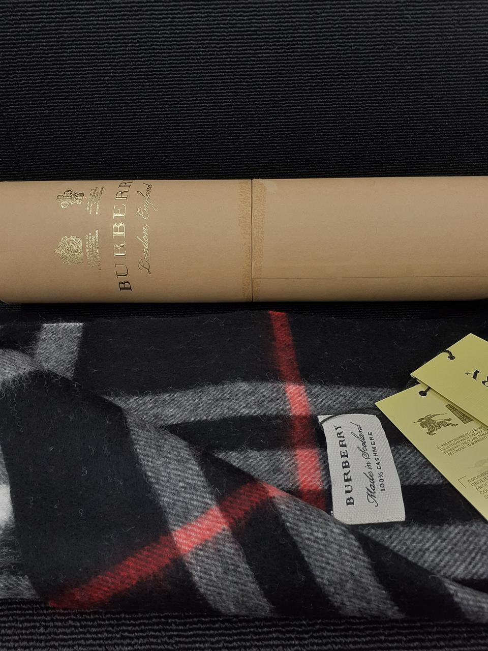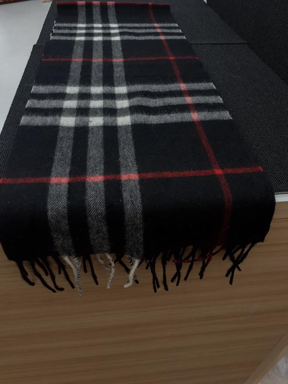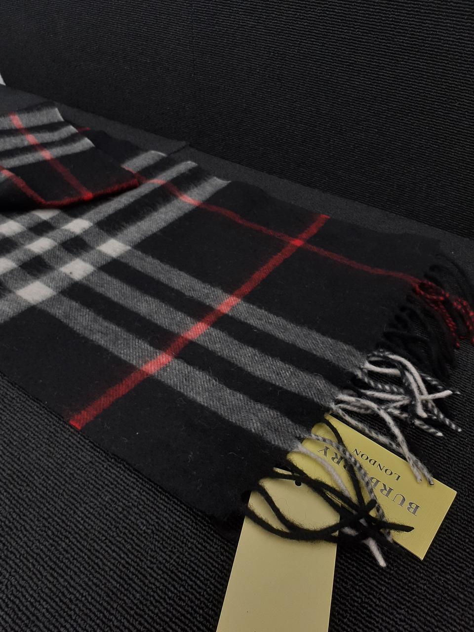 イギリスの老舗ブランドBurberry 上品なカシミアの風合いに黒ベースに白と赤のチェック柄がオシャレなマフラーです
