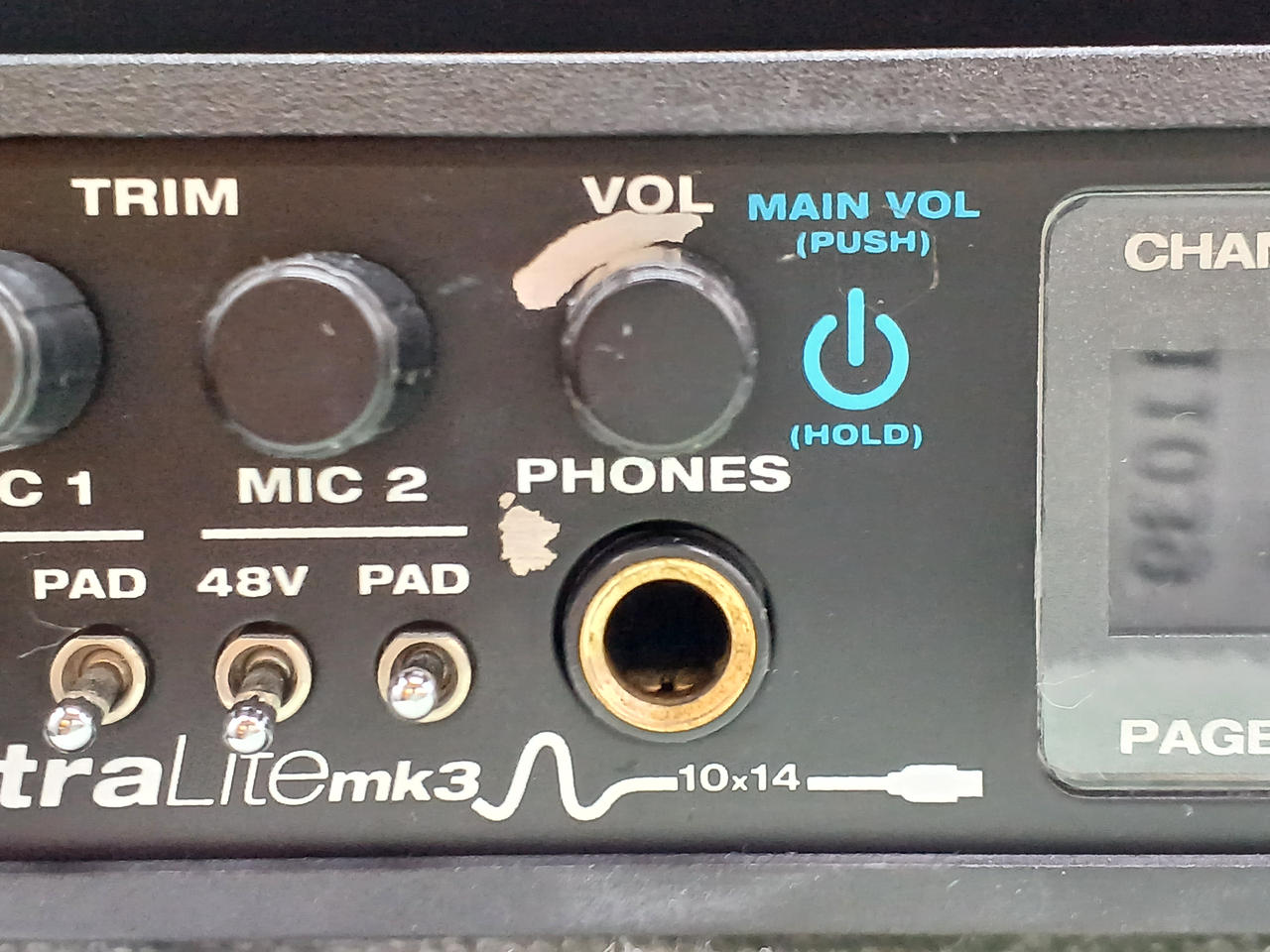 前面のVOLツマミ・PHONE端子の周りに塗装剝がれあります。 |