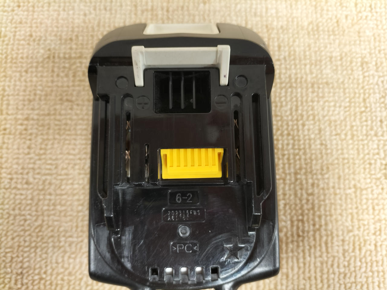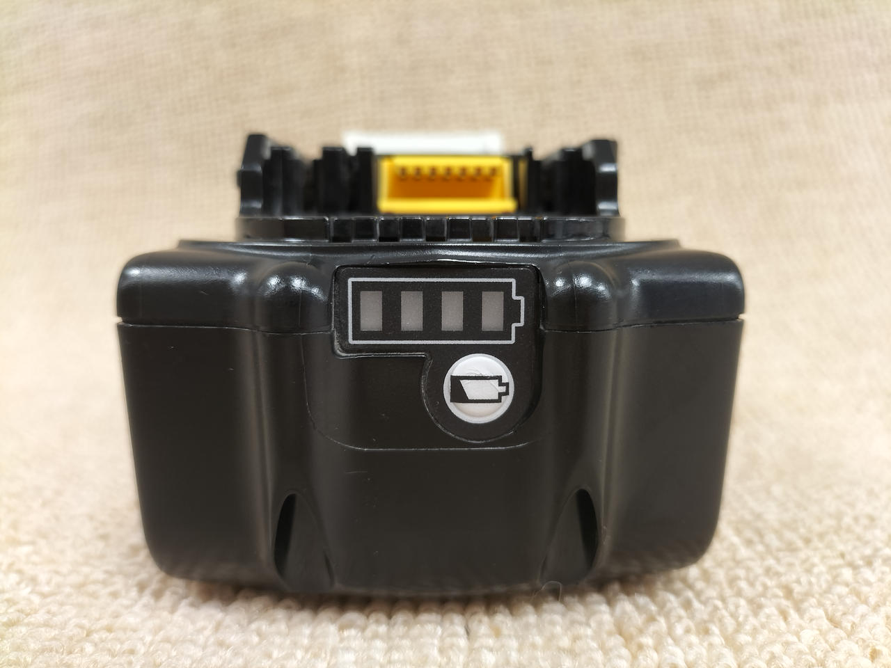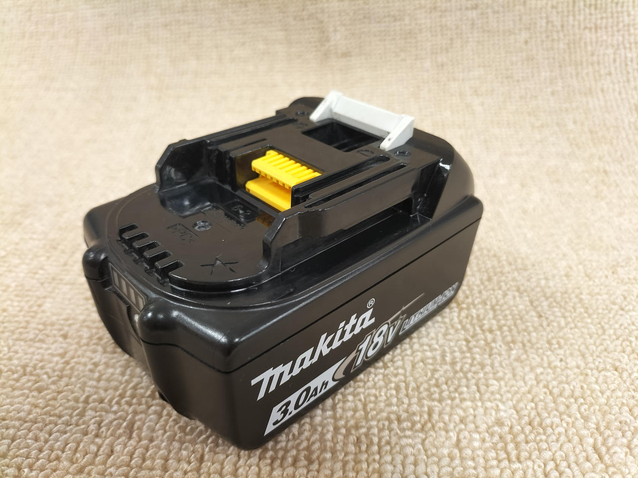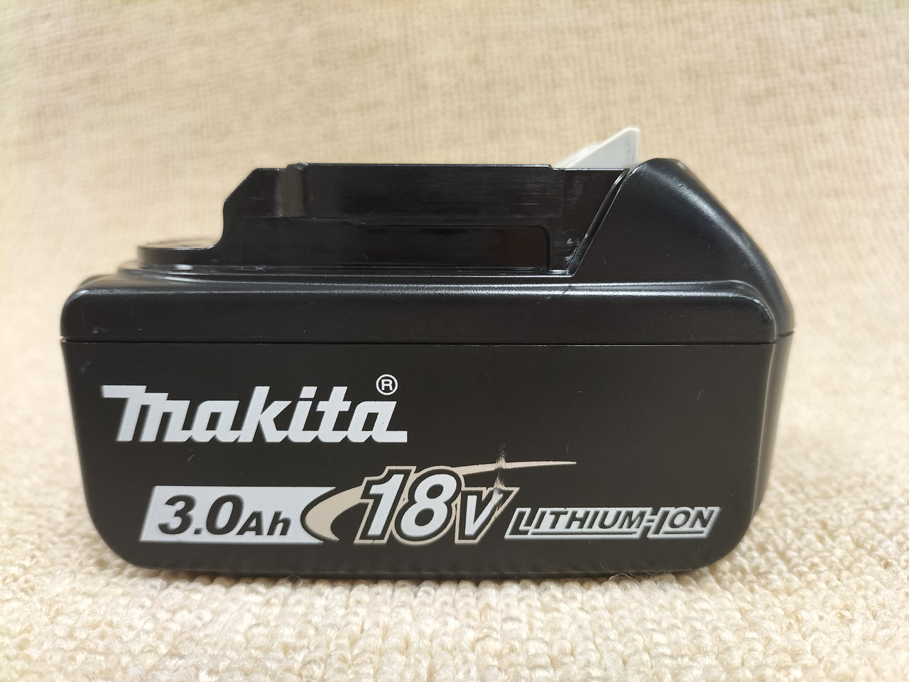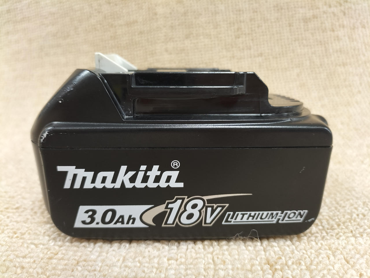 電圧:18V 容量:3.0AH 確認ボタンを押すと4段階残容量表示&2個交互点滅で「故障」を表示。 |