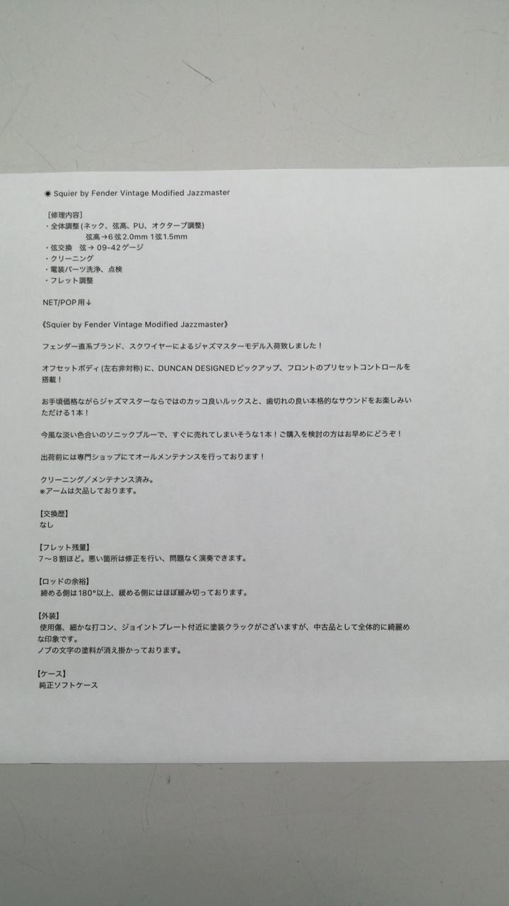 フレット:7〜8割ほど。悪い箇所は修正を行い、問題なく演奏できます。 ロッド:締める側は180°以上、緩める側にはほぼ緩み切っております。 |