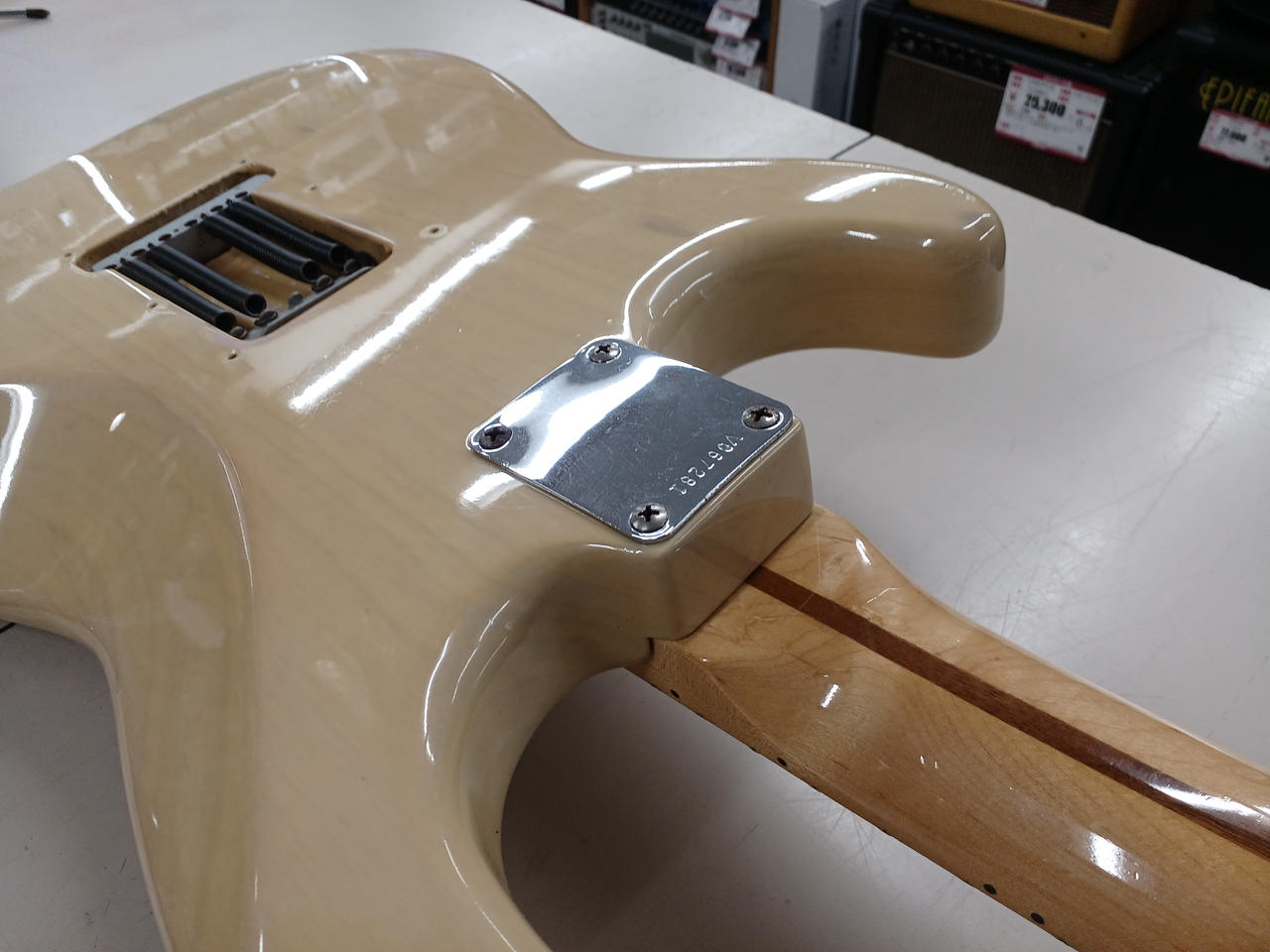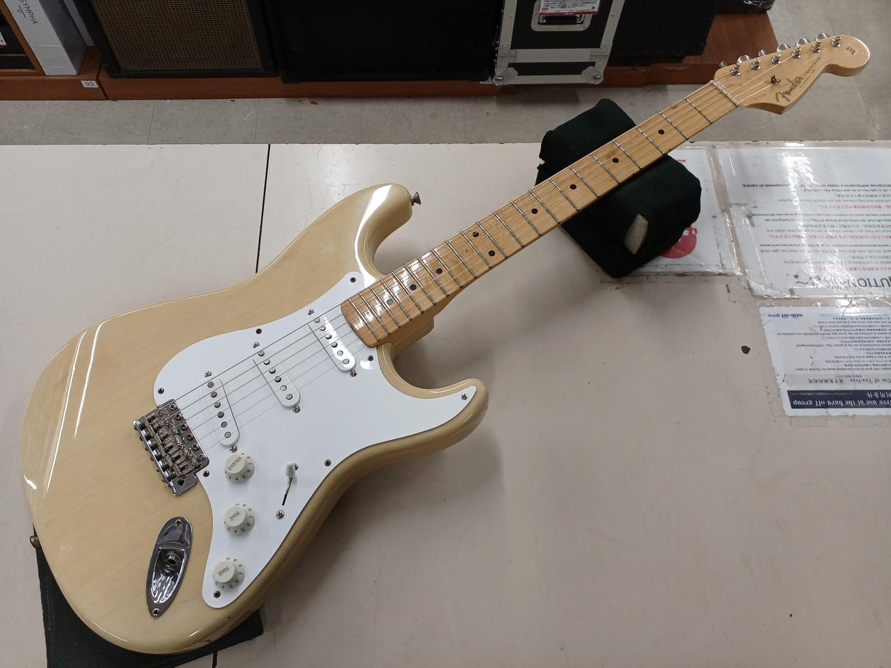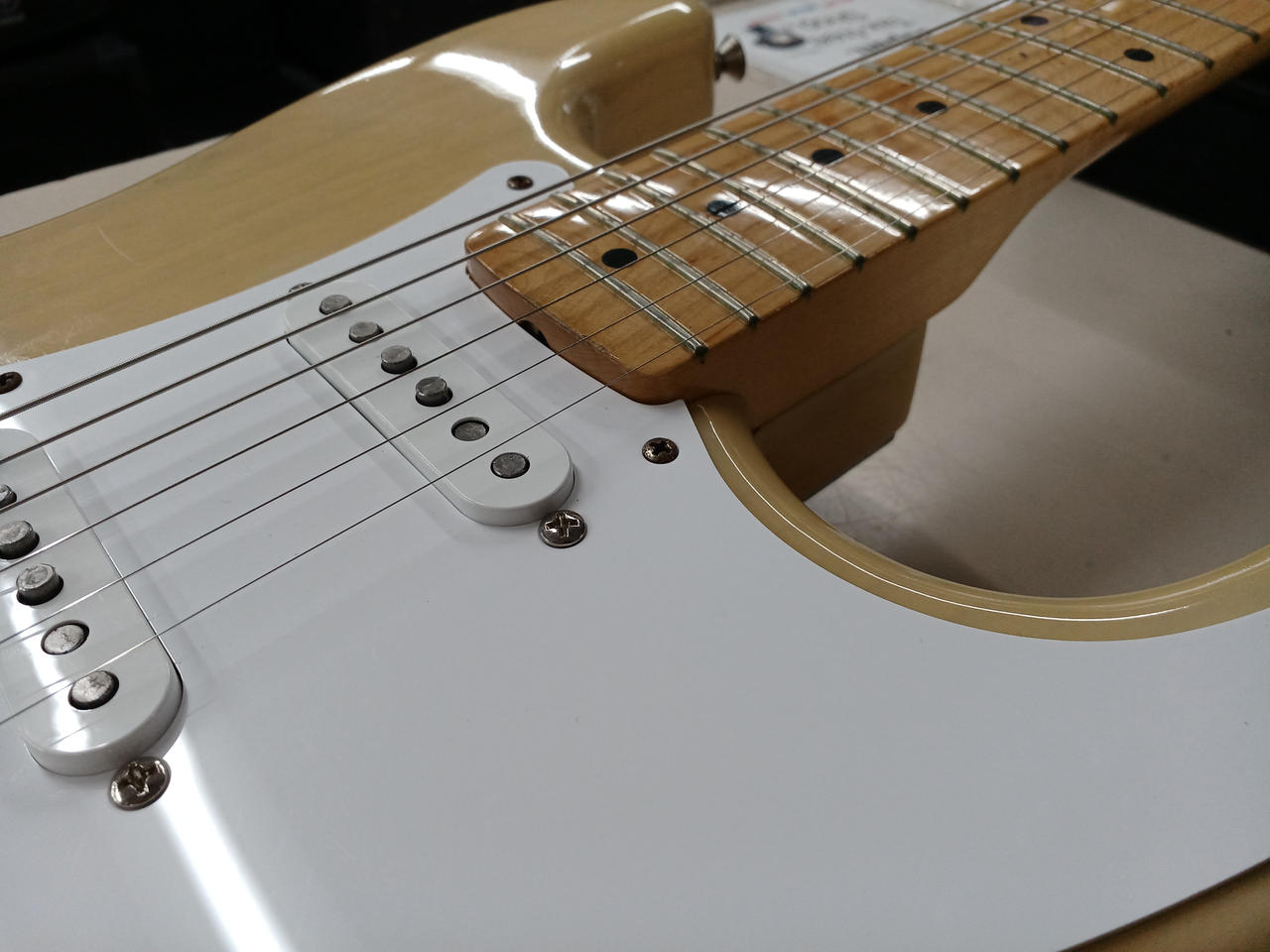 90年代にcustom shopから発売されていたビンテージシリーズから、56年の仕様を忠実に再現したモデル。ソフトVシェイプのメイプル1Pネックにライトアッシュボディ。ピックアップはcustom shop製Fat '50sに、その他電装系もCTS+オレンジドロップに一新されています。(フロント、センターはオリジナルPU付属)リアにハムのザグリがあり、キャビティ内は導電塗料が塗られています。重量3.3kgと軽量ながら、倍音豊かでレスポンスの早いサウンドです。 |