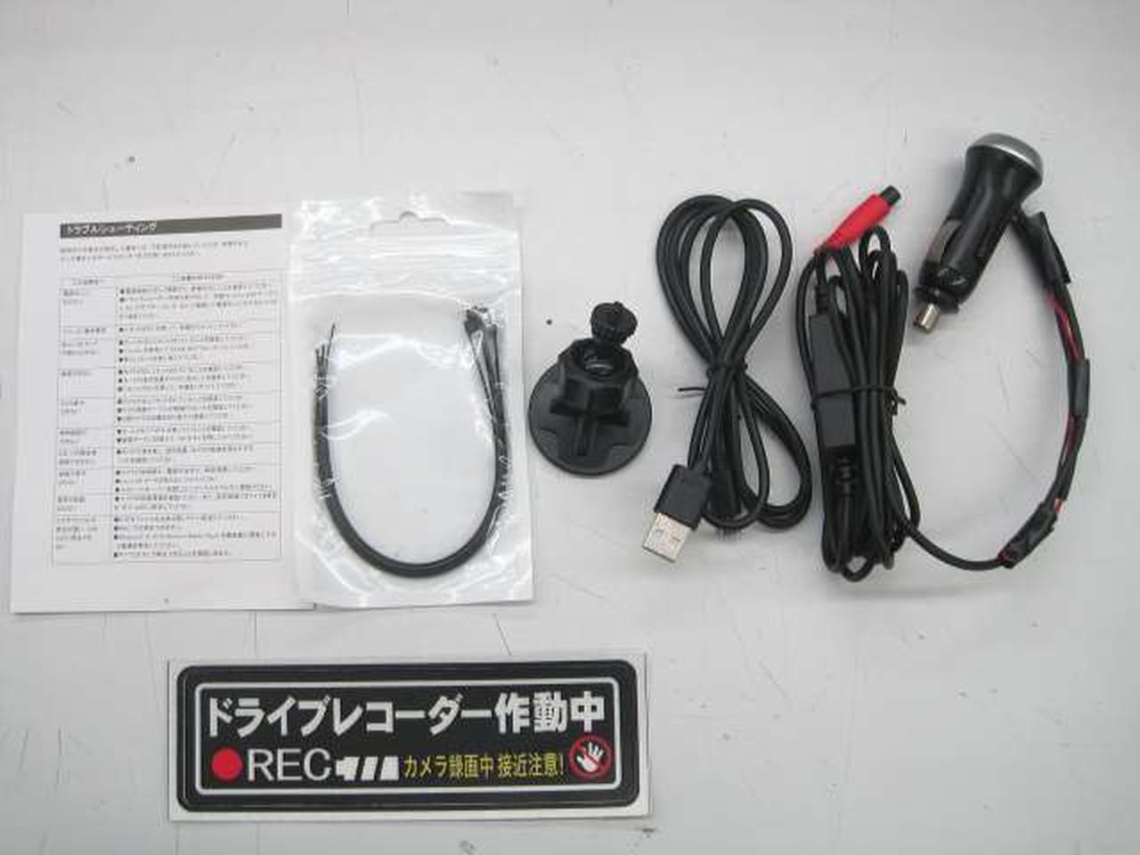 箱、取説、前後カメラ、シガーアダプタ、有線リモコン、MicroSD32GB、MicroUSBケーブル付き。 |