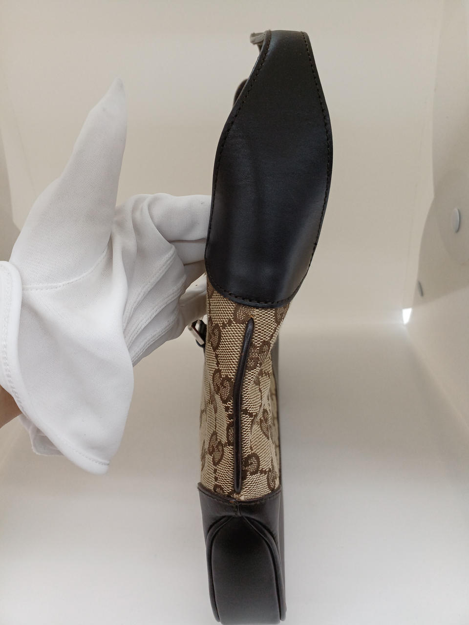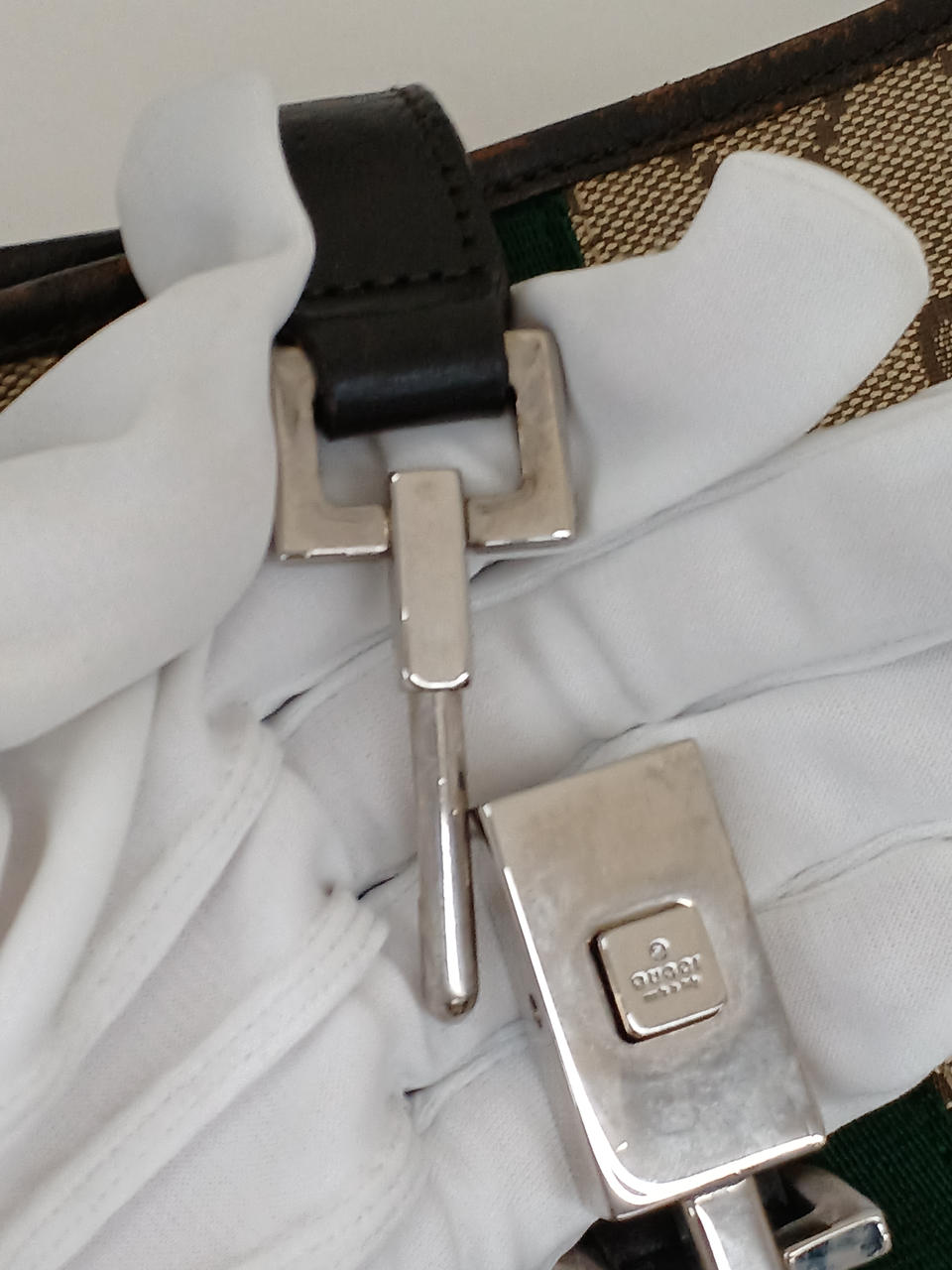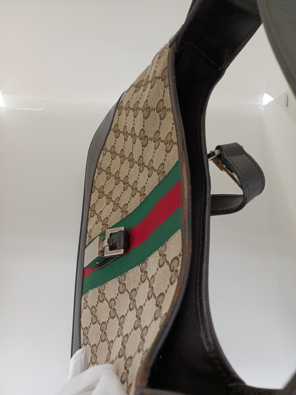 ガラスケースにて販売しております。持ち手や留め具部分に汚れがありますが、欠損はなくまだまだ安心してご利用いただけるお品物になります。