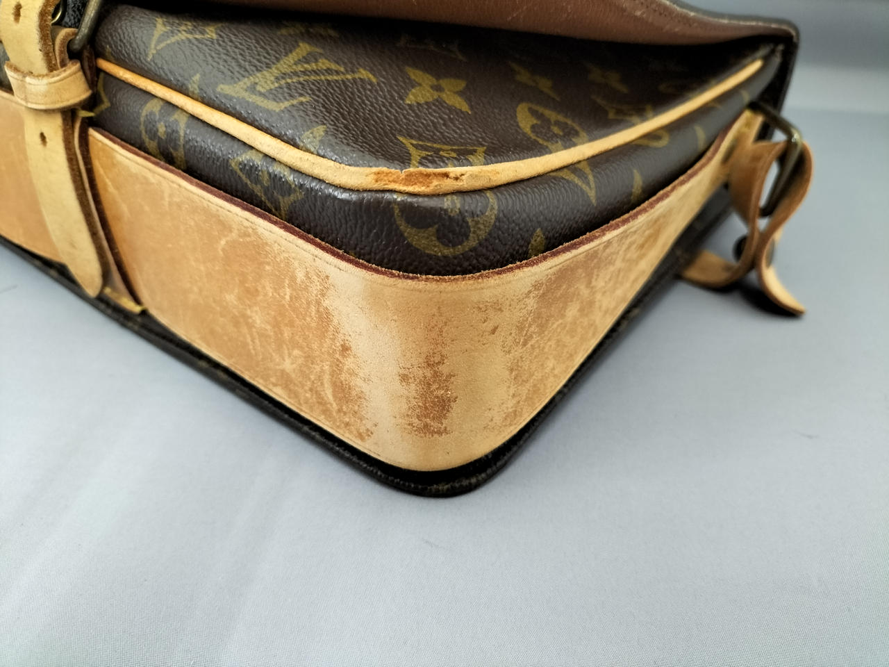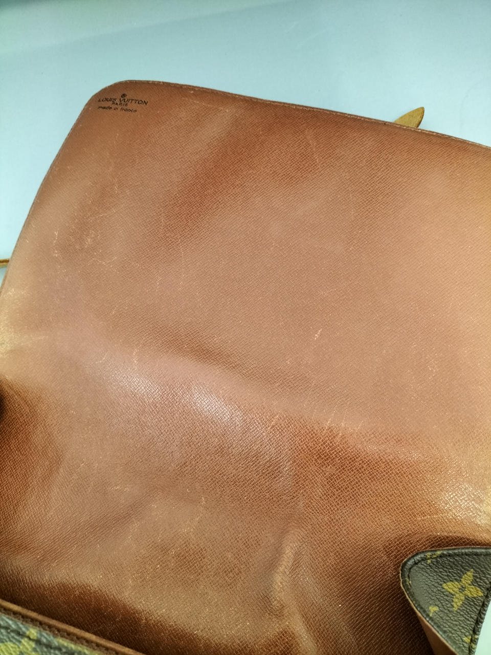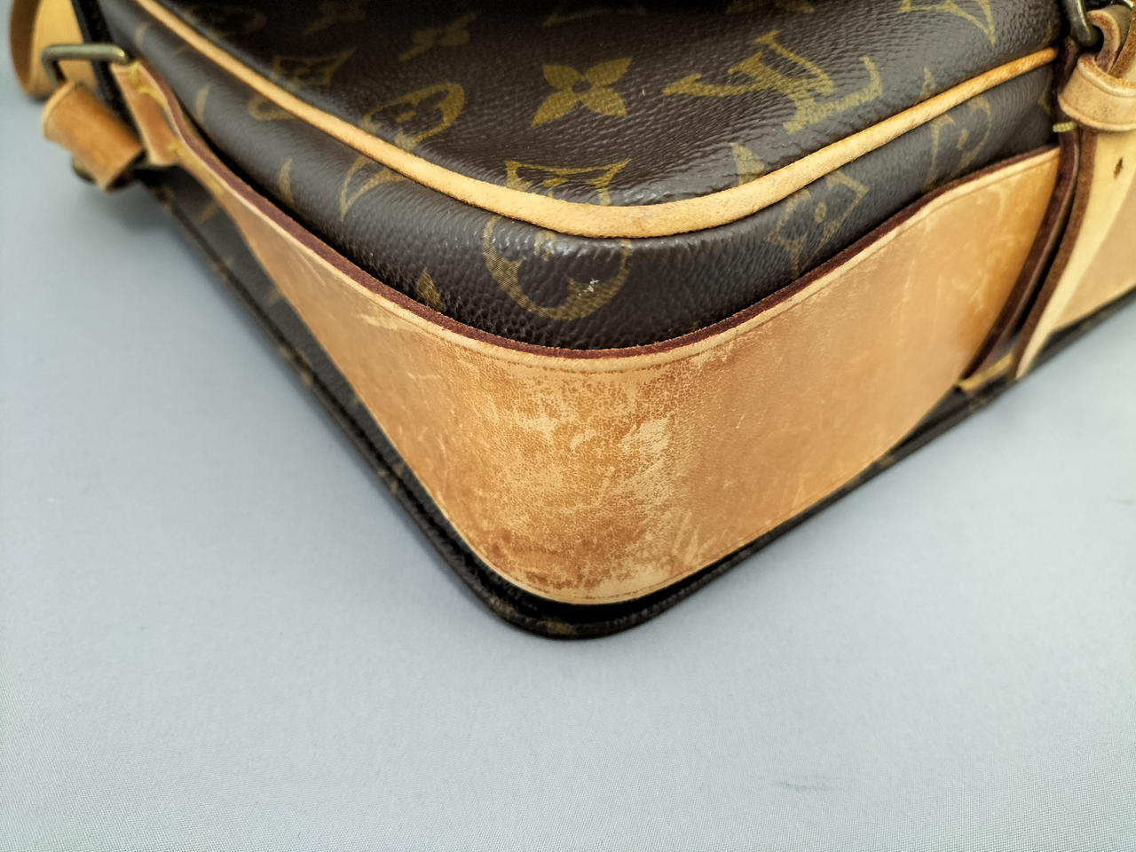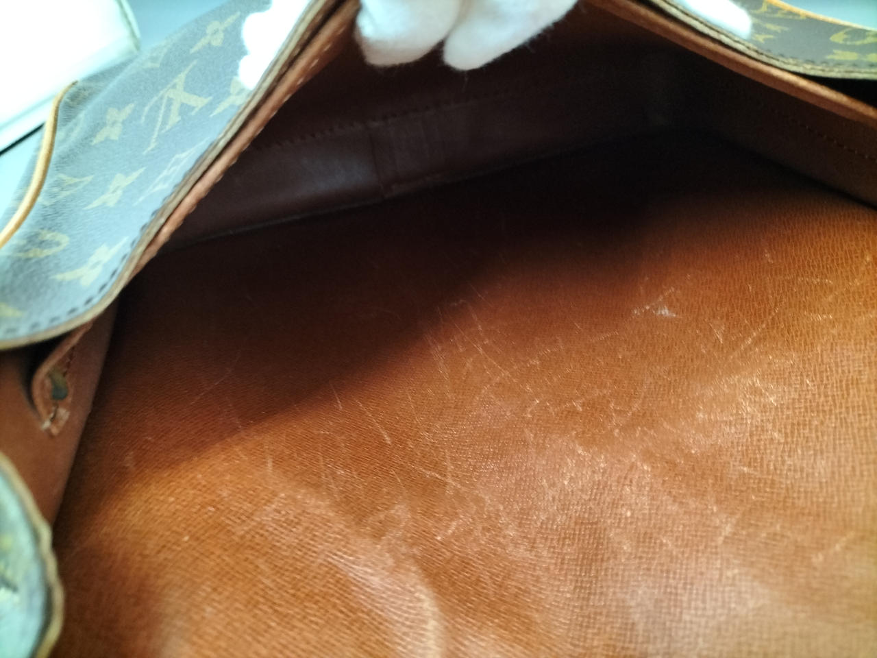 傷やシミ、擦れ等全体的にダメージがあります。ショルダー割れて裂けてきている部分も見受けられます。また、型崩れもしています。 |