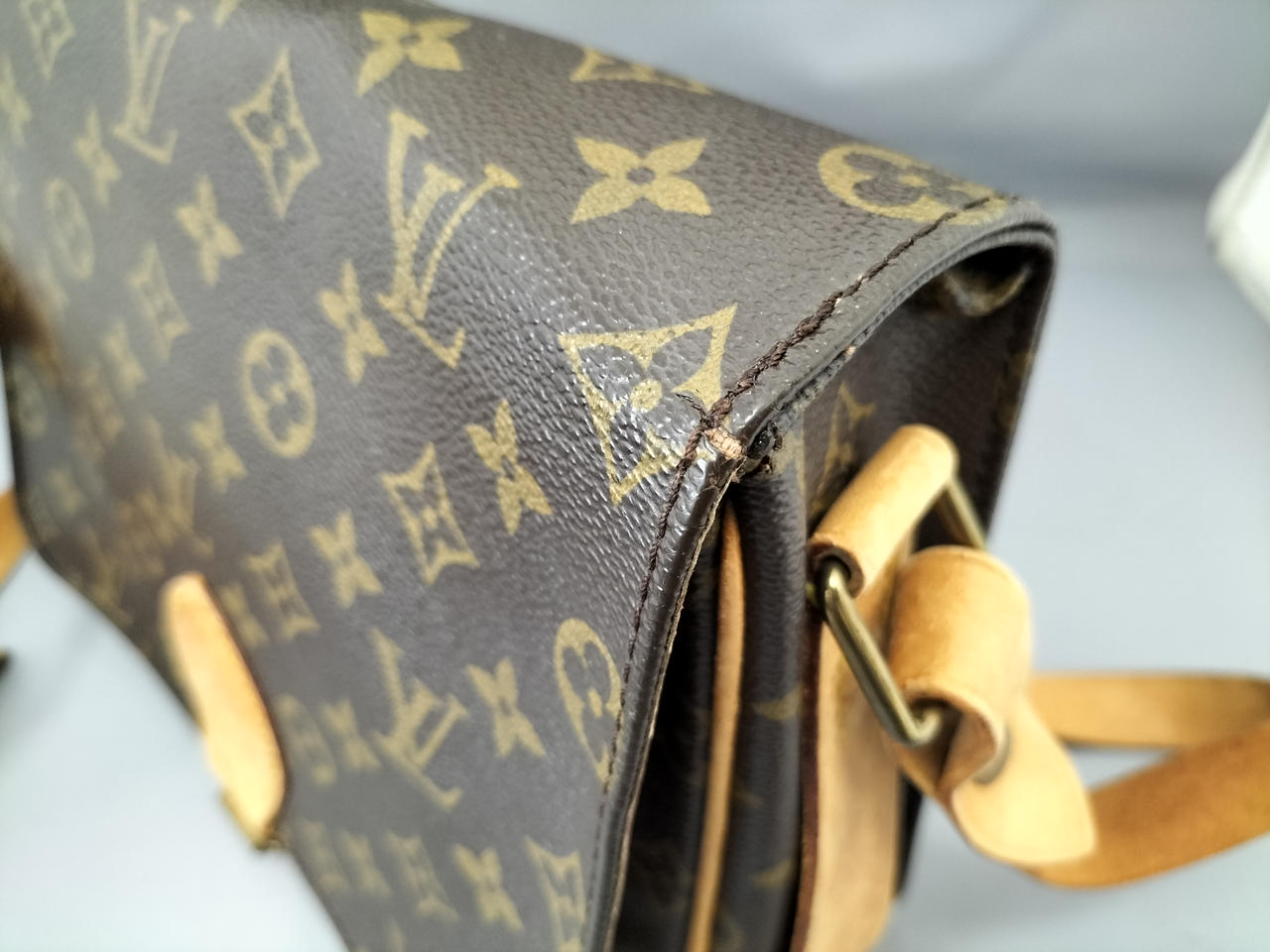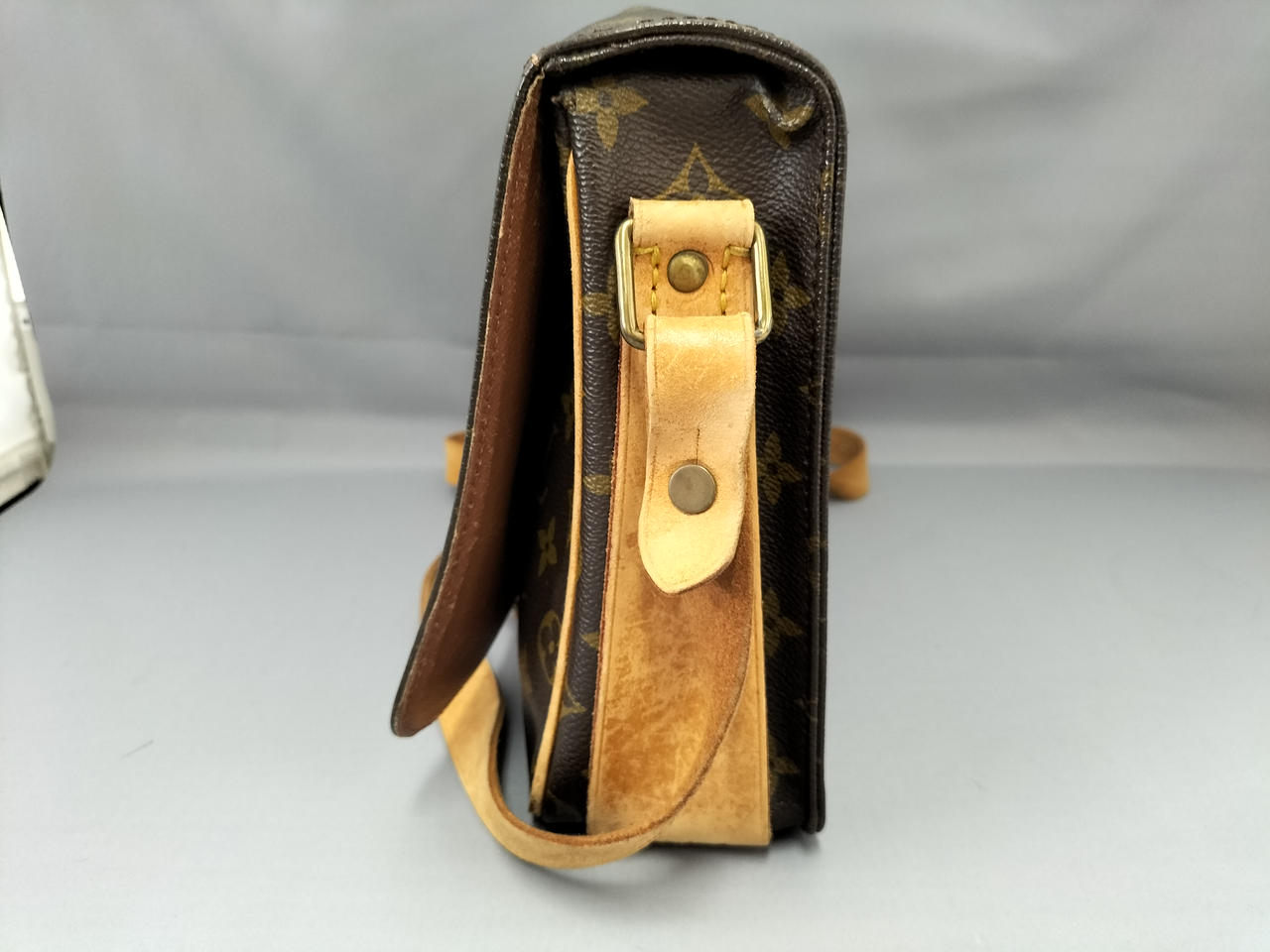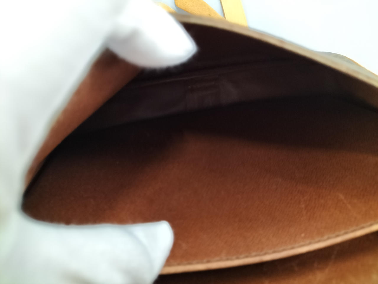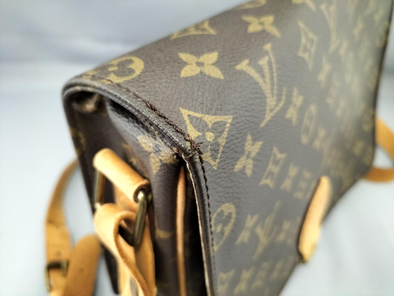 傷やシミ、擦れ等全体的にダメージがあります。ショルダー割れて裂けてきている部分も見受けられます。また、型崩れもしています。 |