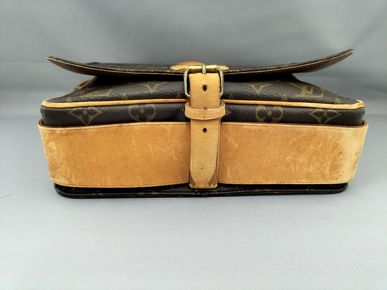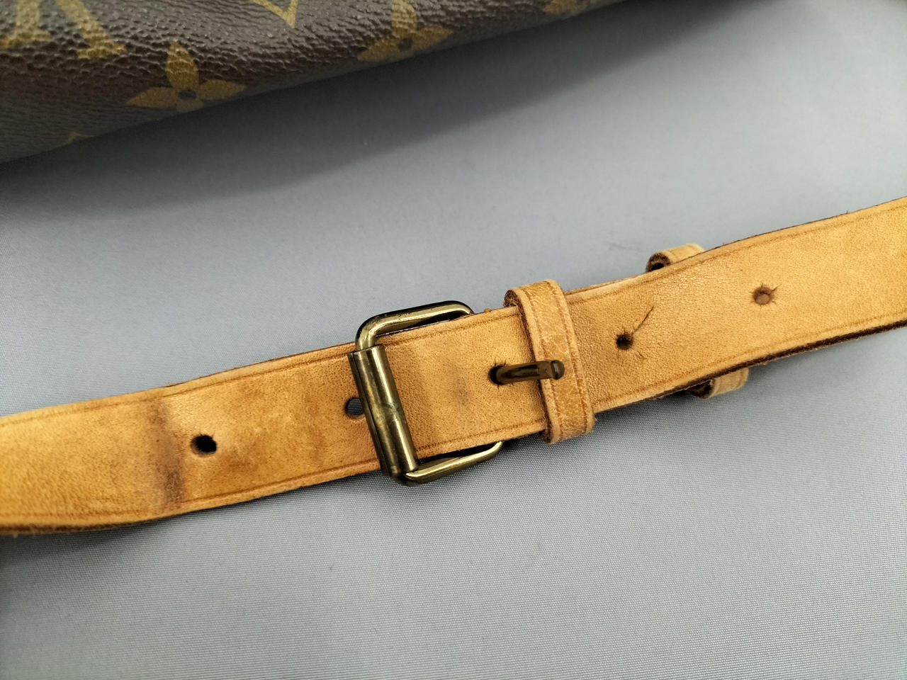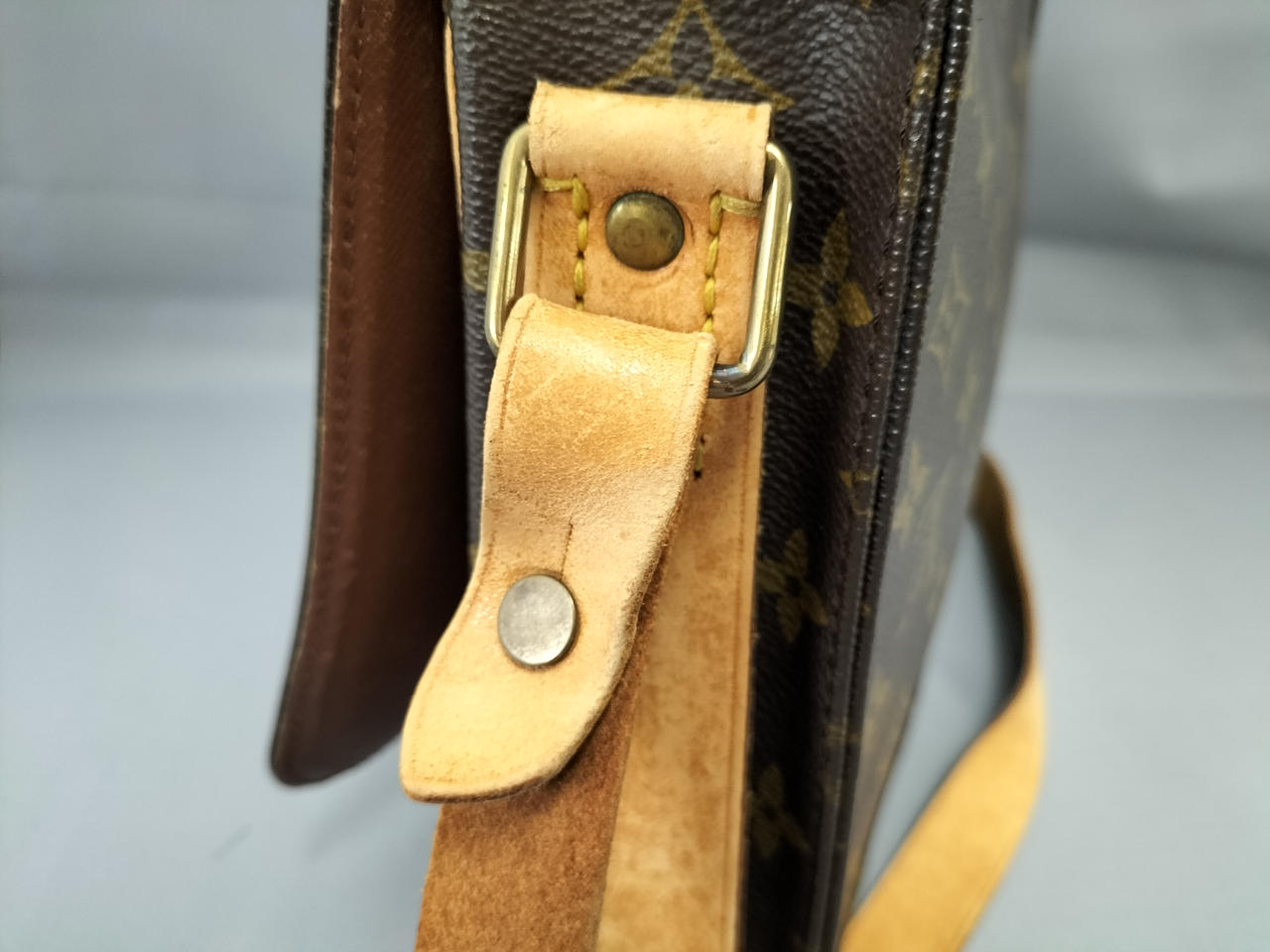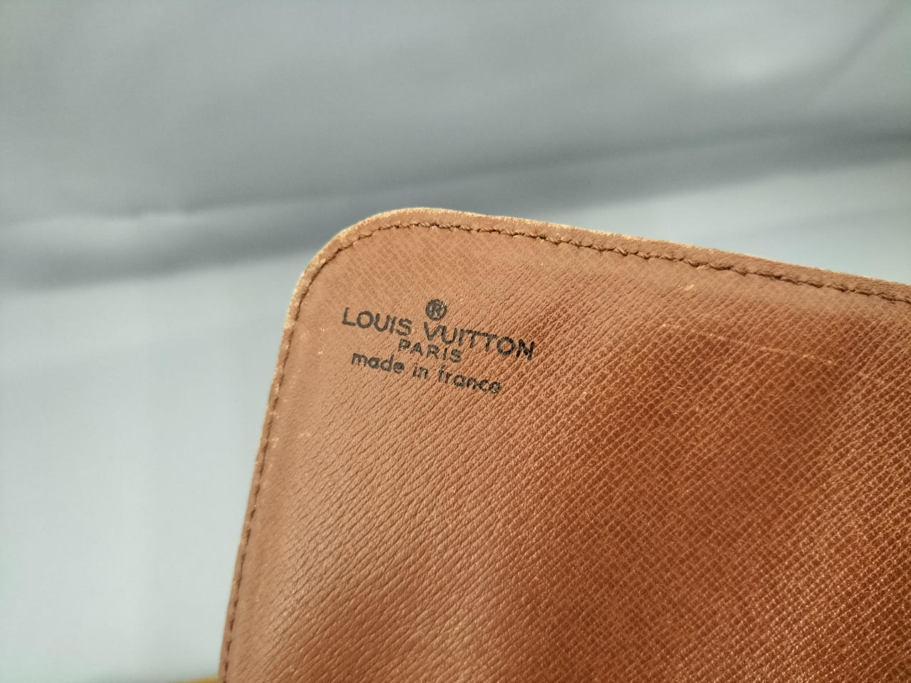 傷やシミ、擦れ等全体的にダメージがあります。ショルダー割れて裂けてきている部分も見受けられます。また、型崩れもしています。 |