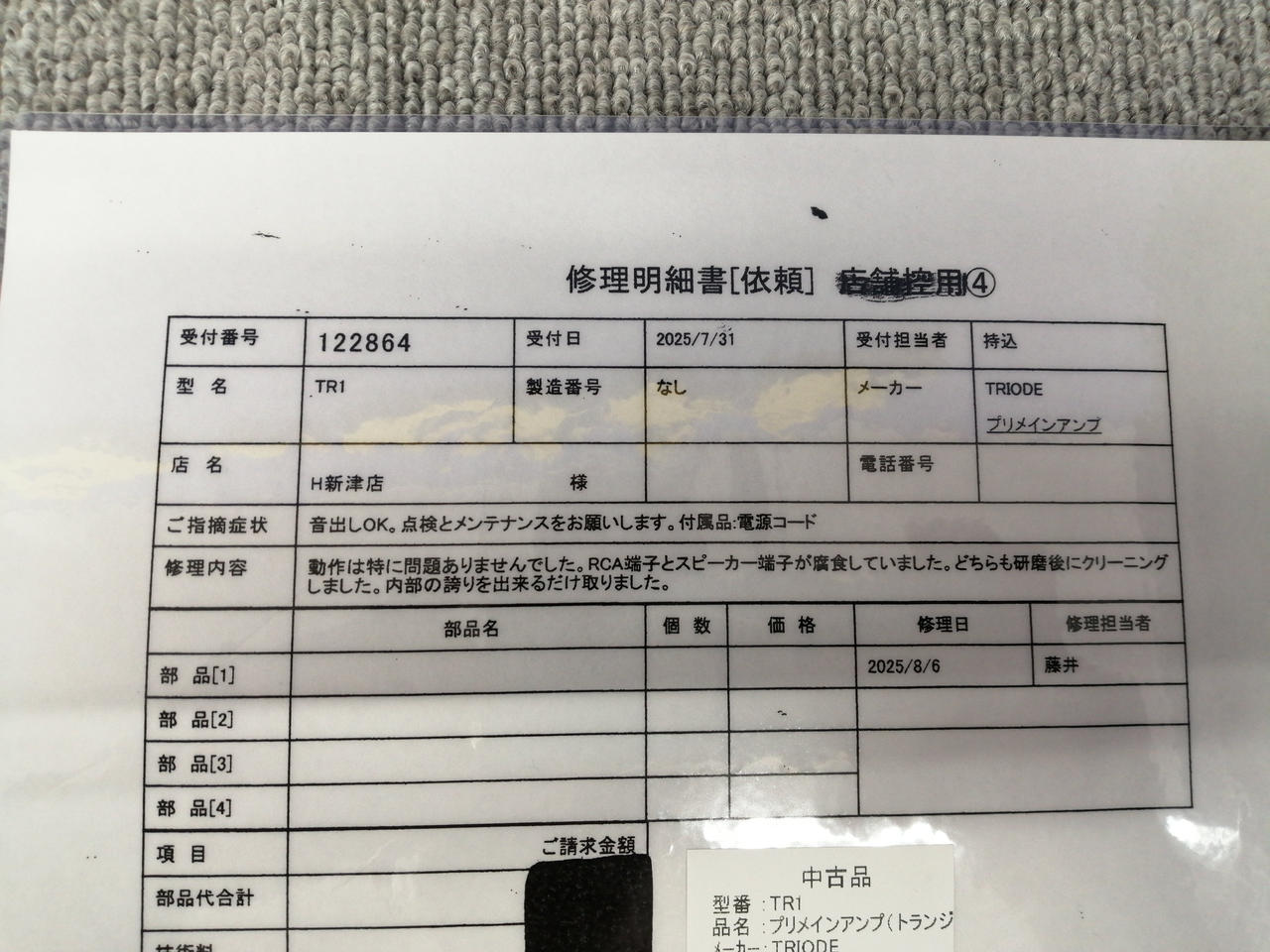 メンテナンス内容:動作は特に問題ありませんでした。RCA端子とスピーカー端子が腐食していました。どちらも研磨後にクリーニングしました。内部のほこりをできるだけ取りました。 |