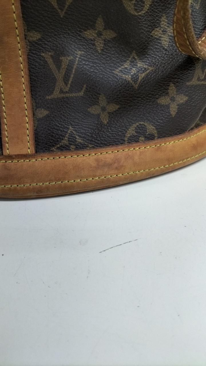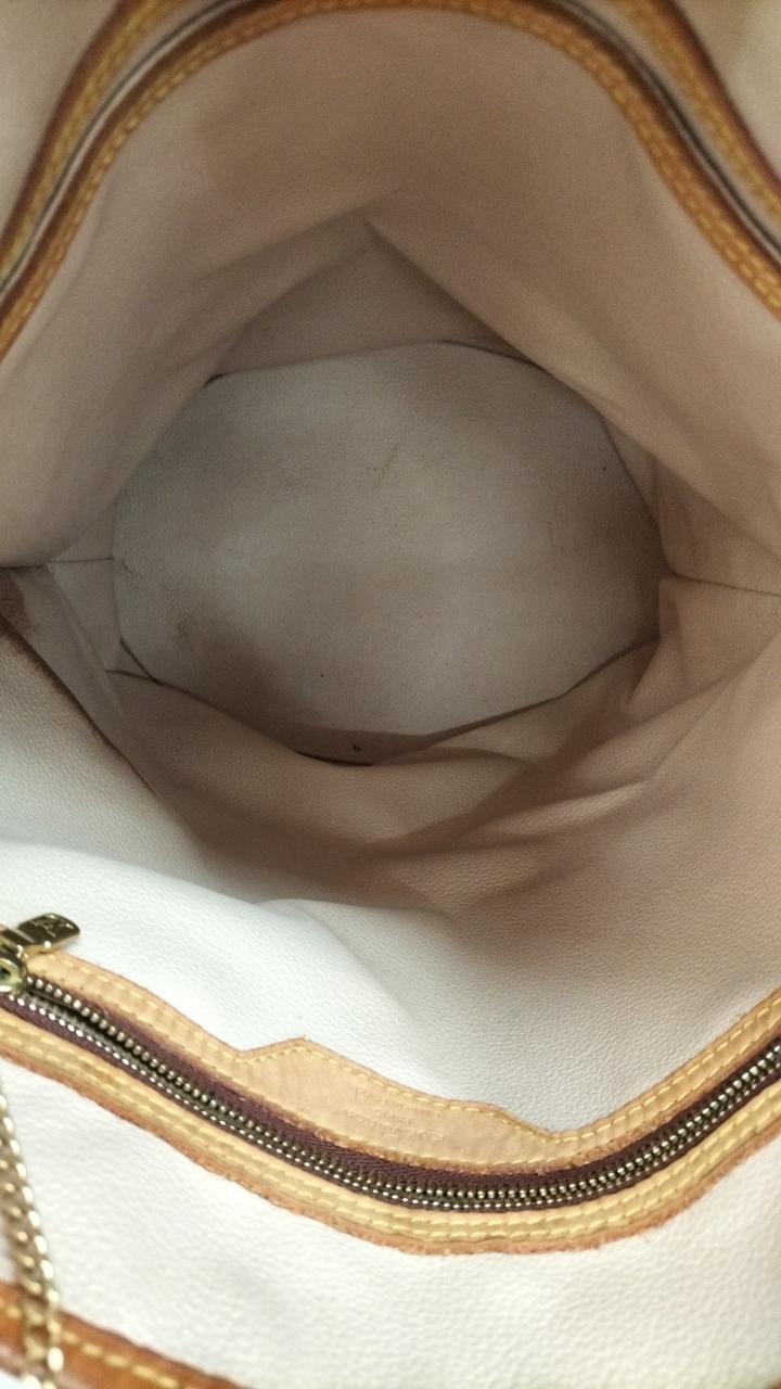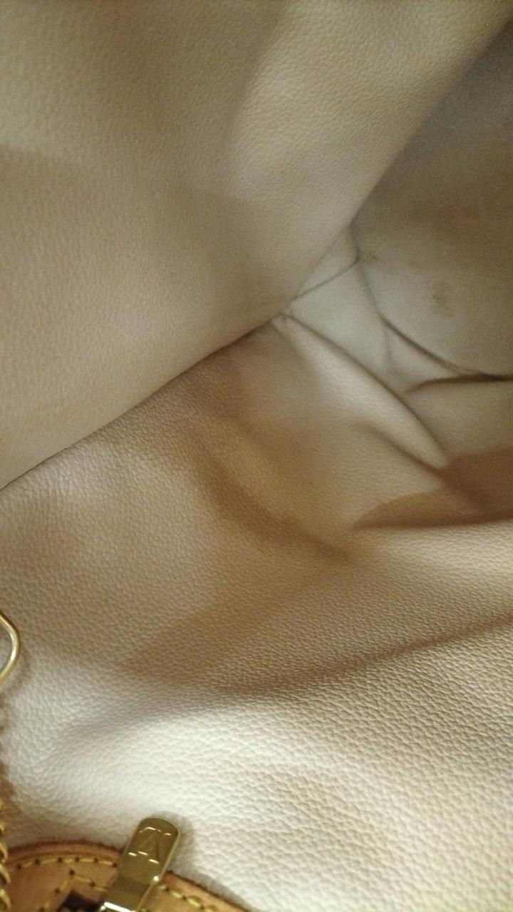 全体的に使用感が感じられます。またレザー部分にもシミや亀裂になりそうな部分も見受けられます。また型崩れしています。内側にもシミのような物が見受けられます。 |